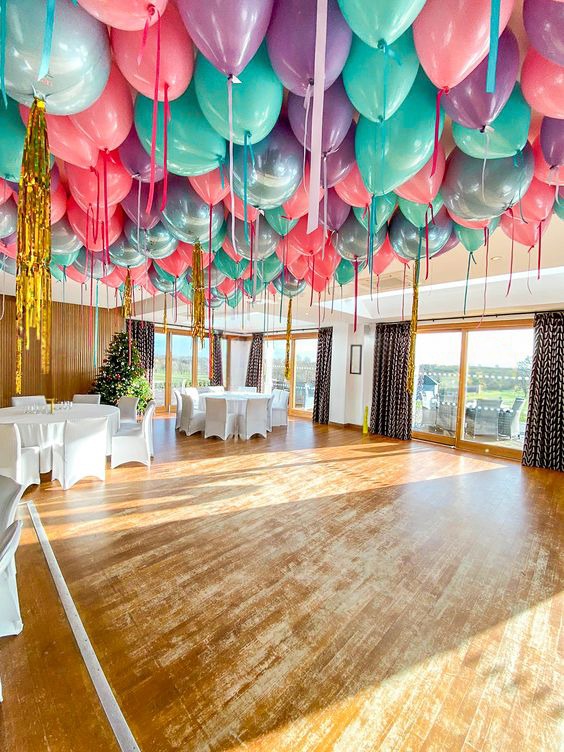 Разноцветные шары под потолок с надписью “С Днем Рождения”
