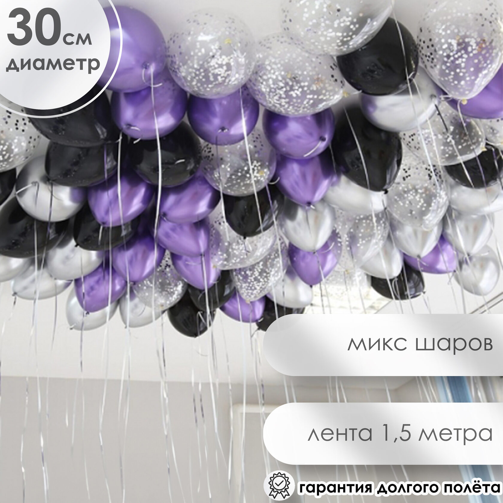 50 шаров под потолок фиолетовый хром, черный, серебро хром и шары с конфетти