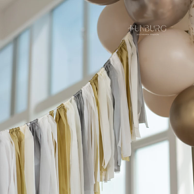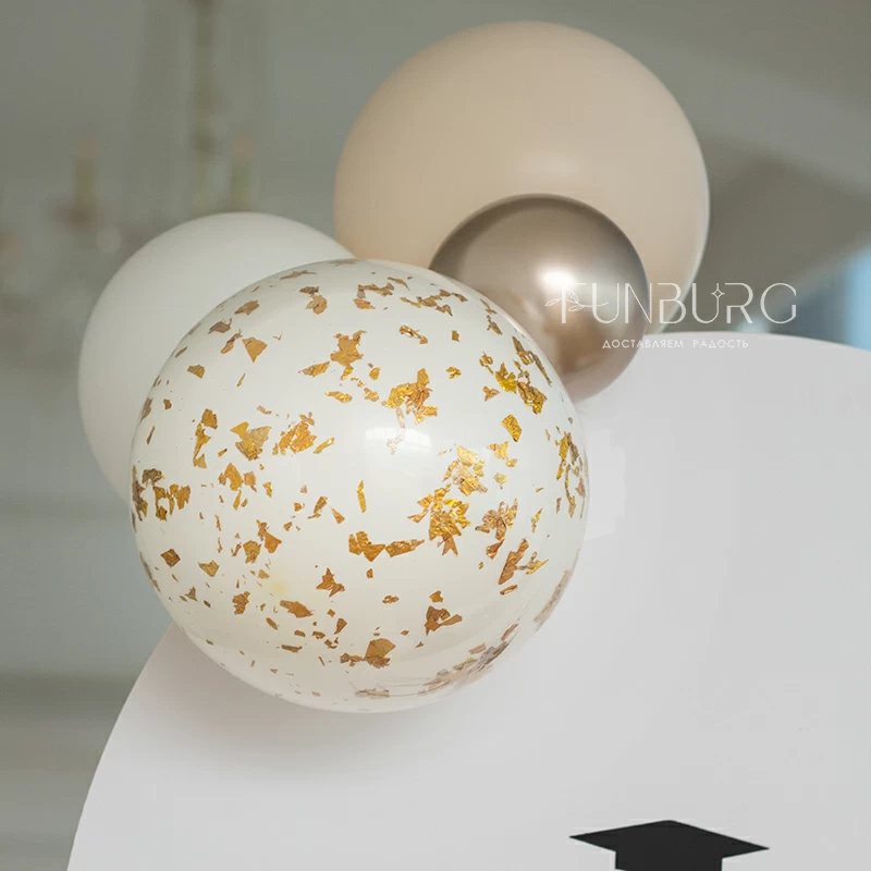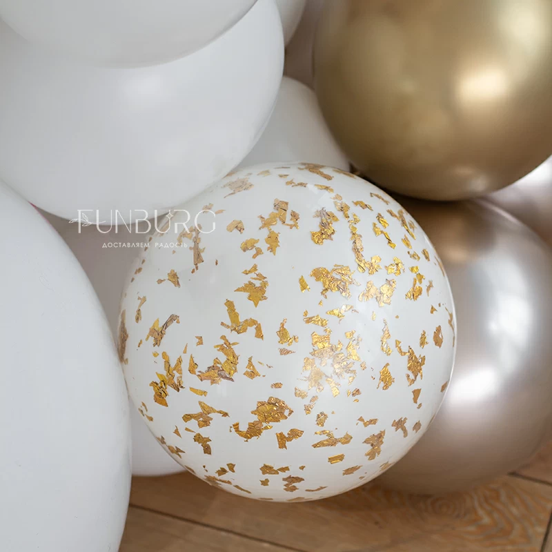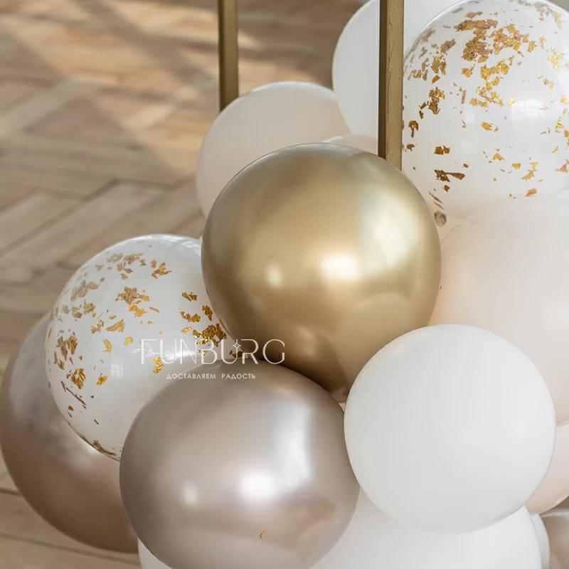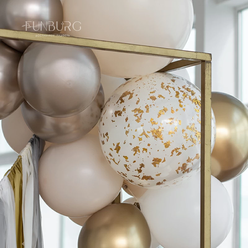 Стильная прямоугольная арка (3D-каркас золотого цвета) с декором из шариков нескольких текстур и оттенков (сияющий Chrome, матовый белый и кремовый, глянцевые шары с конфетти), пышной гирляндой-бахромой и кругом с надписью (ее можно сделать любой) станет идеальной основной для праздничной фотозоны!