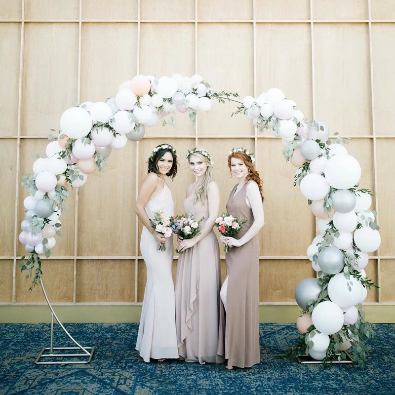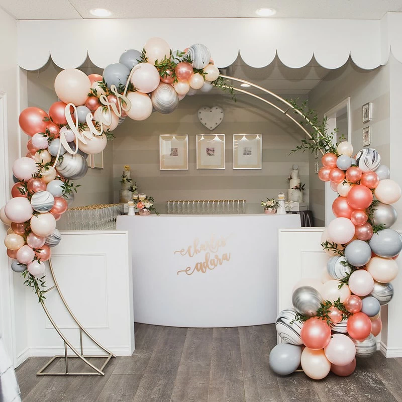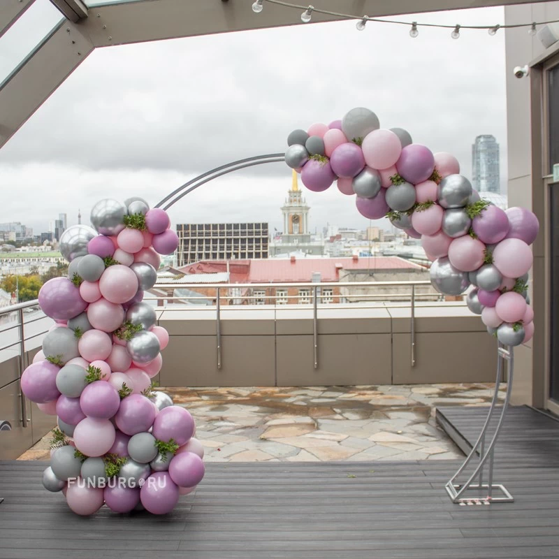 Стильная круглая арка, украшенная асимметричной разнокалиберной гирляндой из воздушных шаров разного диаметра, дополненных веточками зелени, идеально подойдет для выездной свадебной церемонии, украшения кэнди бара и оформления фотозоны. В состав гирлянды может быть изменен по вашему желанию: можно использовать не только простые латексные шары разного размера, но и шарики с конфетти, мраморные шары ручной работы, шары из фольги разной формы и размера (звезды, сердца, круги, сферы, и т.д.). Помимо веточек зелени можно использовать живые или искусственные цветы, сухоцветы и декор, а можно и вовсе отказаться от флористических элементов и создать арку полностью из шариков.