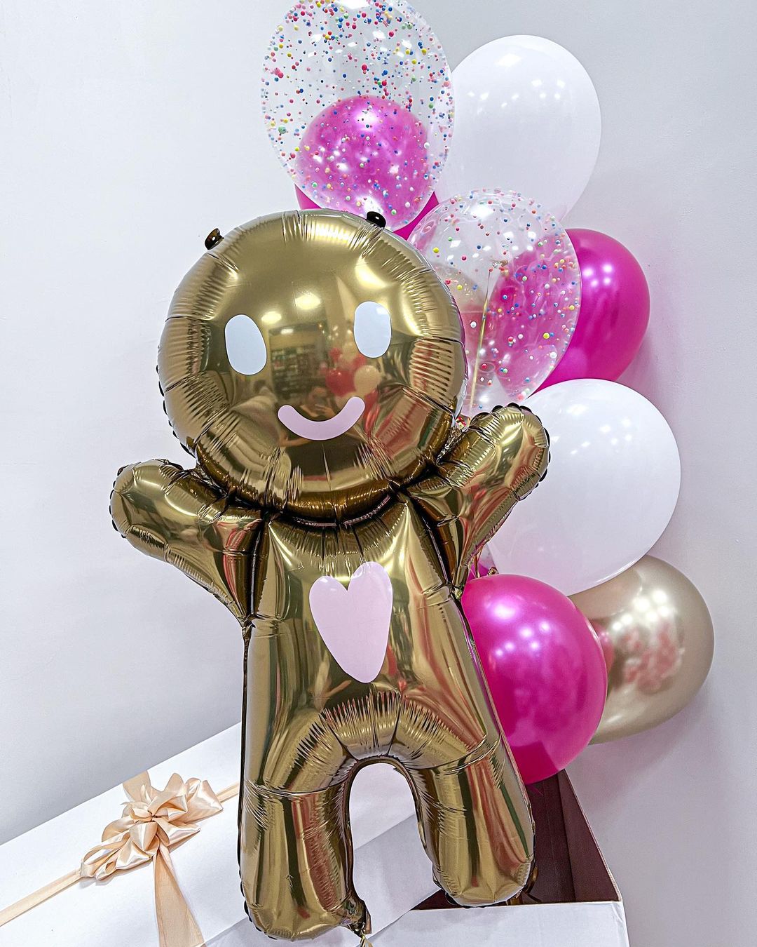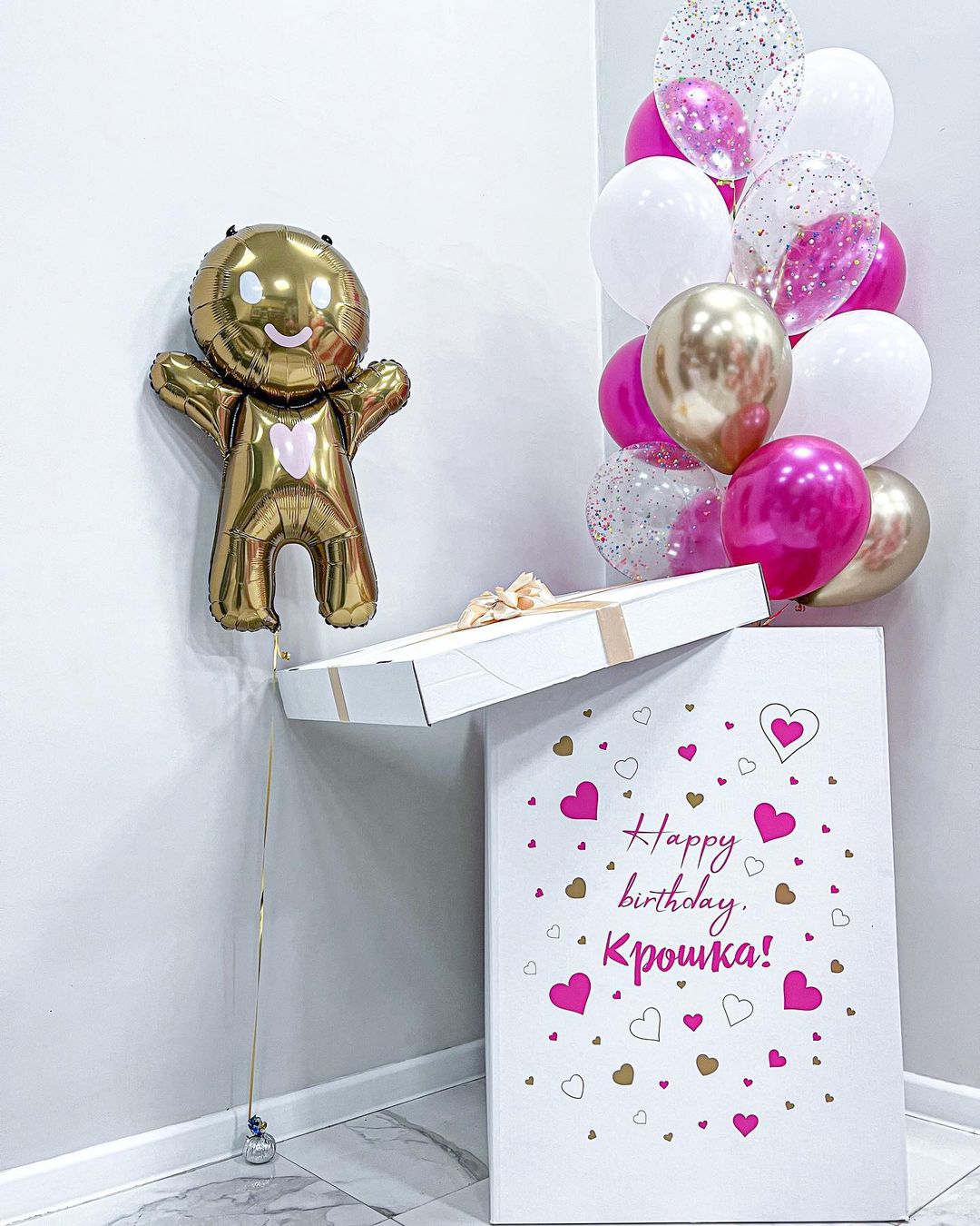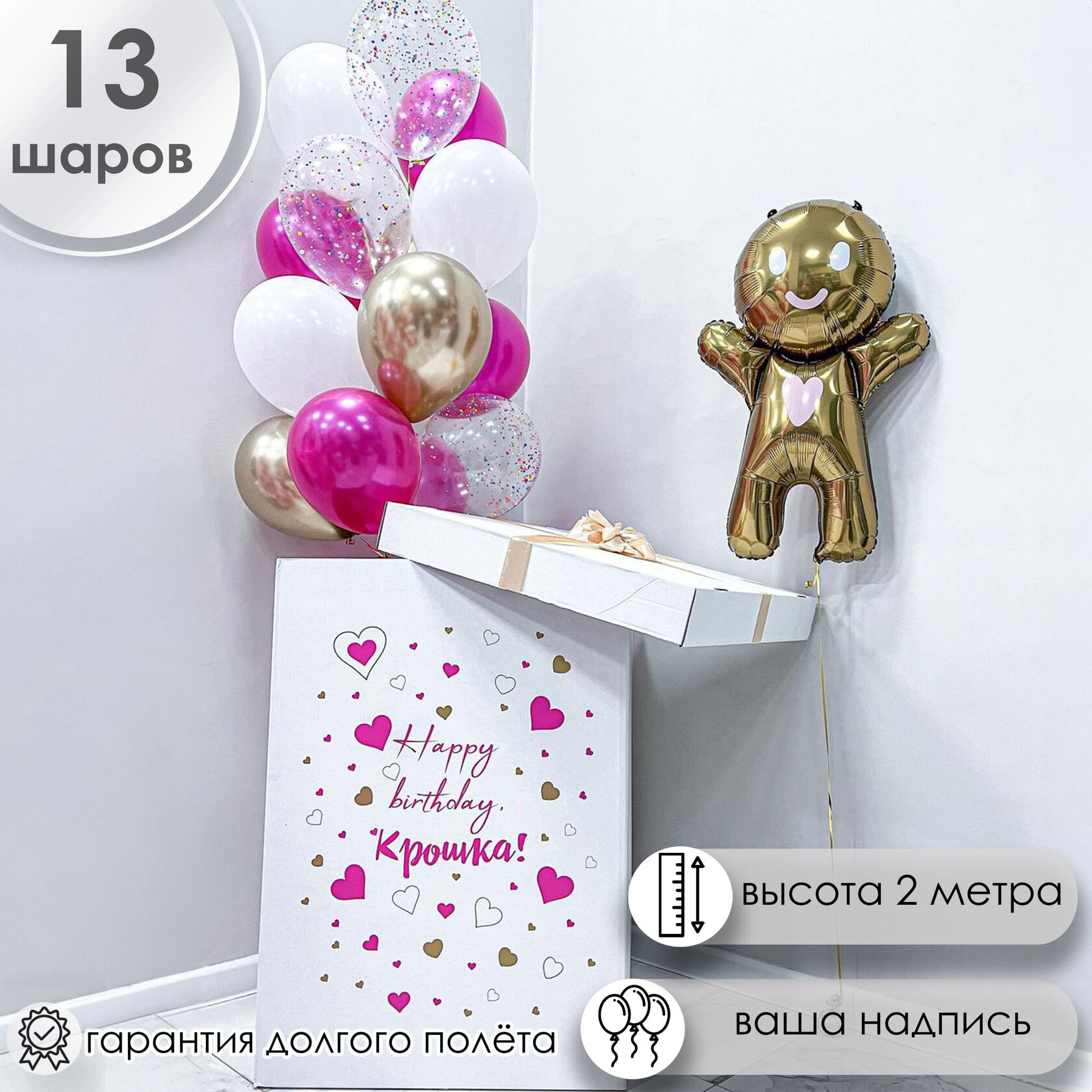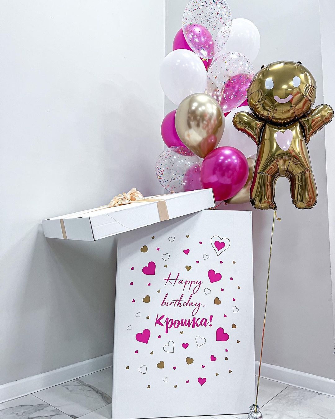 Белая коробка с шарами и пряничным человечком