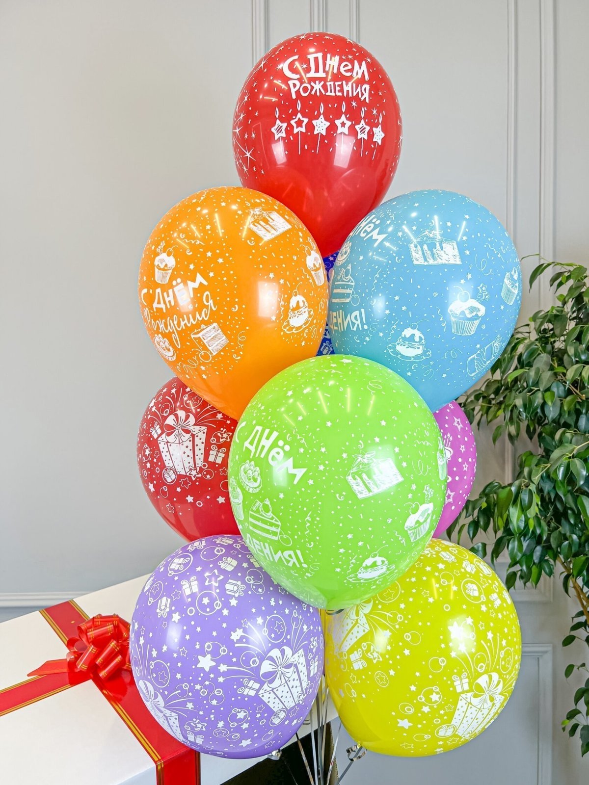 - 10 разноцветных шаров “С Днём Рождения”: Яркие и праздничные, они создадут атмосферу радости и веселья.