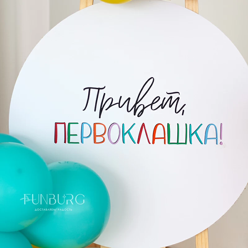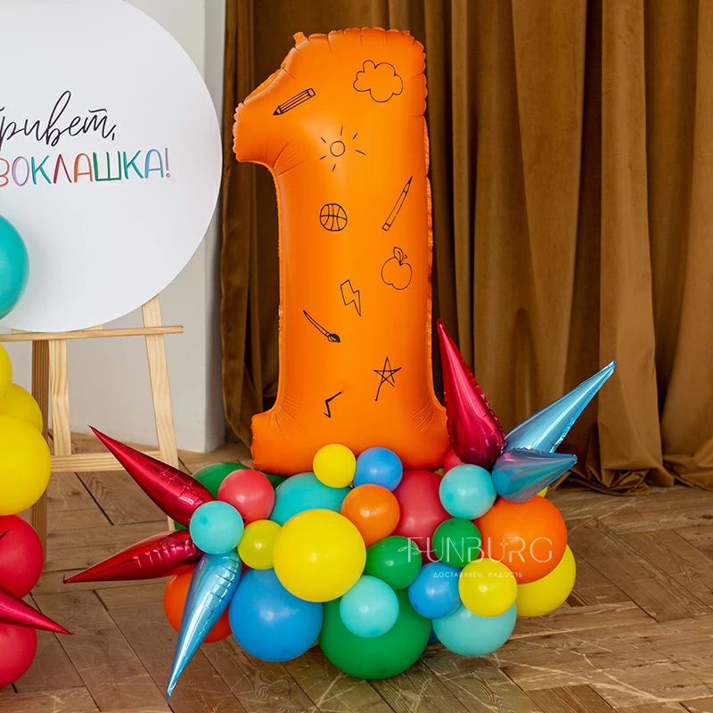 Стильная небольшая яркая фотозона с мольбертом, объёмной разнокалиберной гирляндой из шариков, дополненных декоративными лучиками, с фигурой с солнечно-оранжевой цифрой с рисунками (она может быть любой) и кругом, на который можно нанести любую надпись, идеально подходит для небольших оформлений, украшения класса к 1 Сентября, а если изменить надпись, то фотозона отлично подойдет для детских домашних праздников и фотосессий.