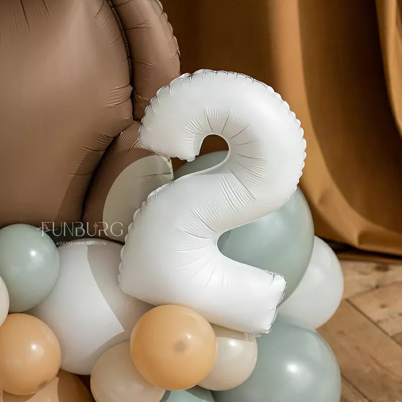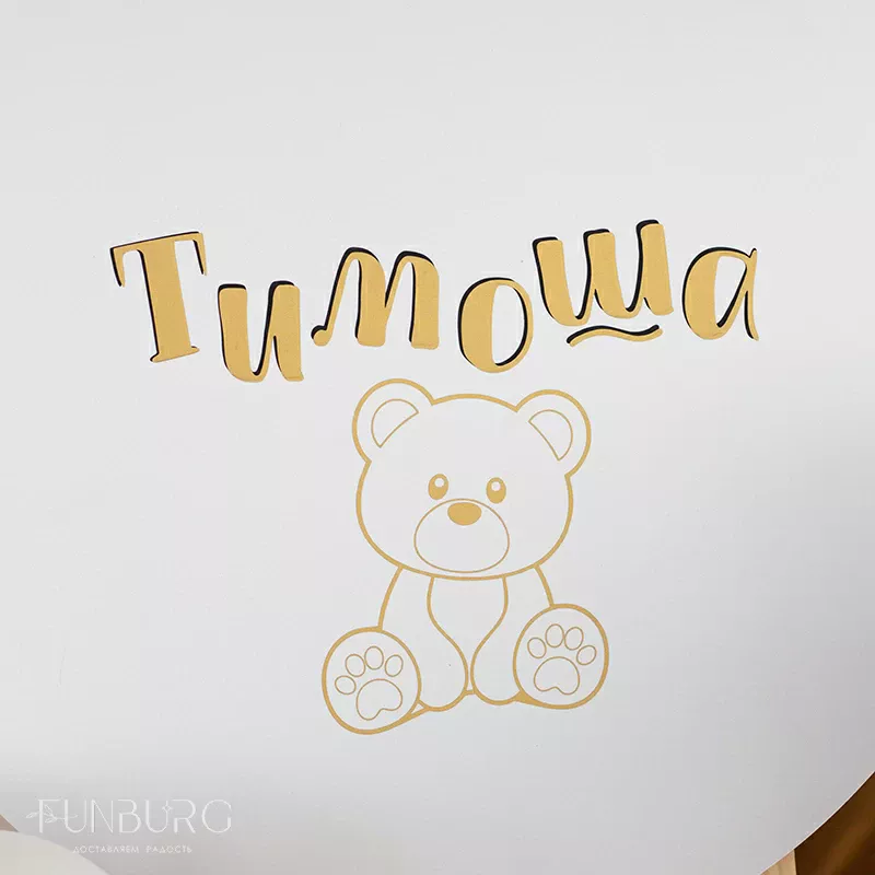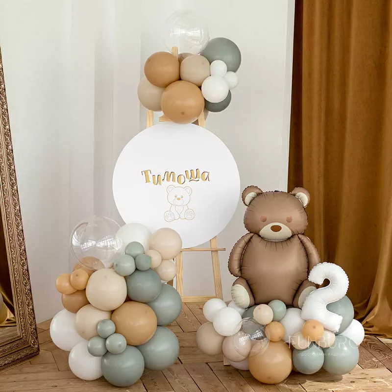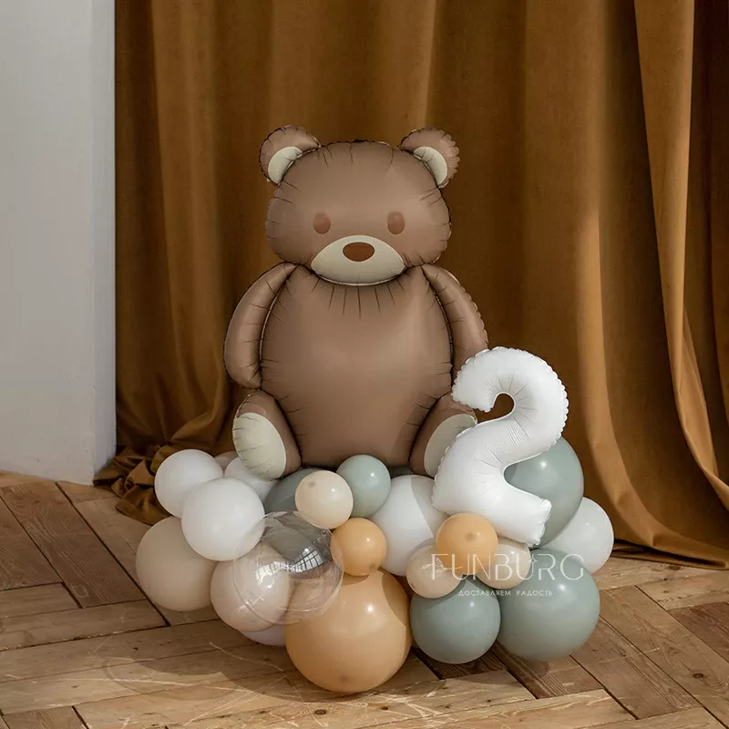 Стильная небольшая фотозона с мольбертом, разнокалиберной гирляндой из шариков мягких природных оттенков, фигурой с очаровательным мишкой и маленькой цифрой и кругом, на который можно нанести любую надпись, идеально подходит для небольших оформлений, домашних праздников и фотосессий.