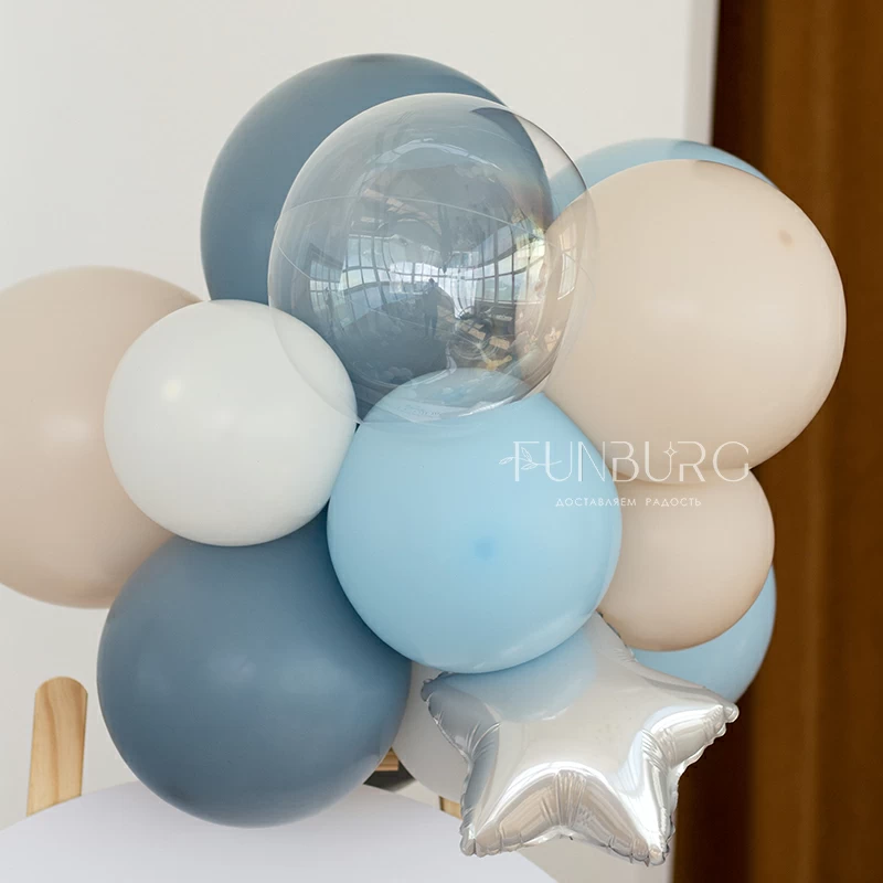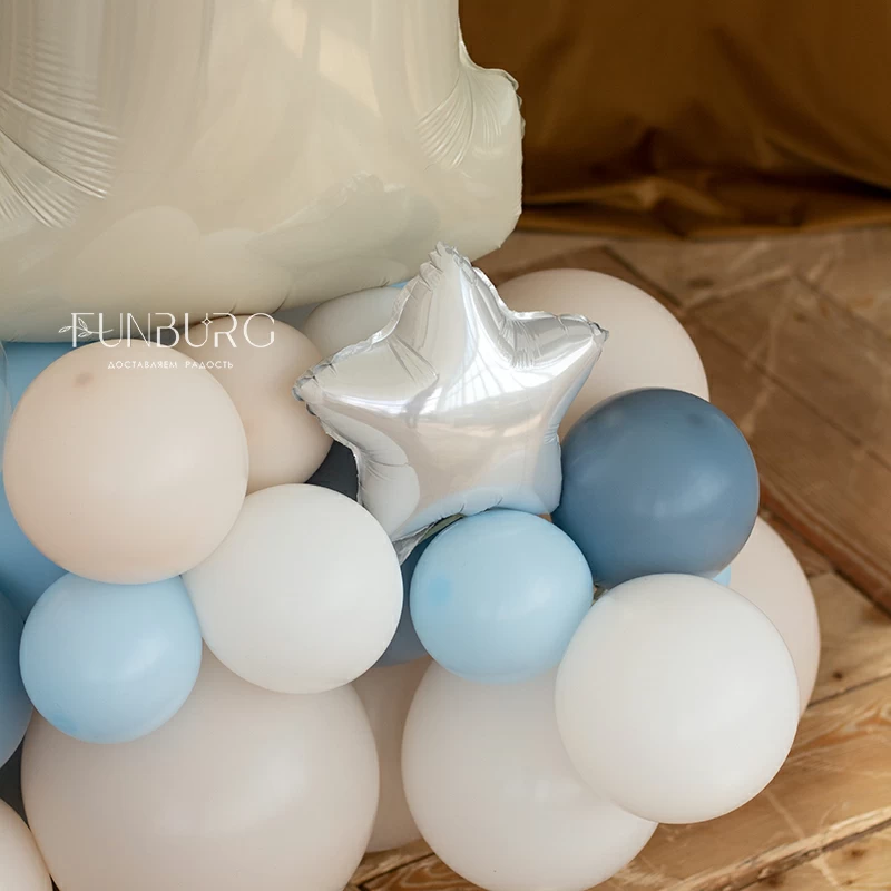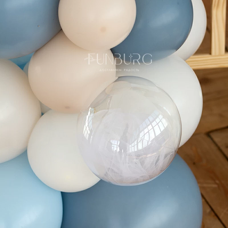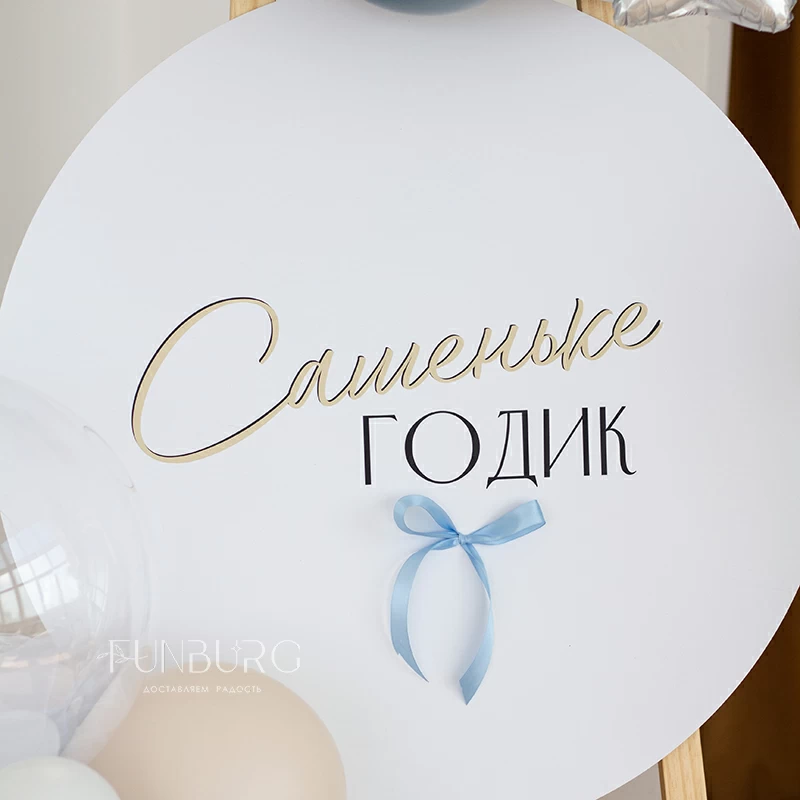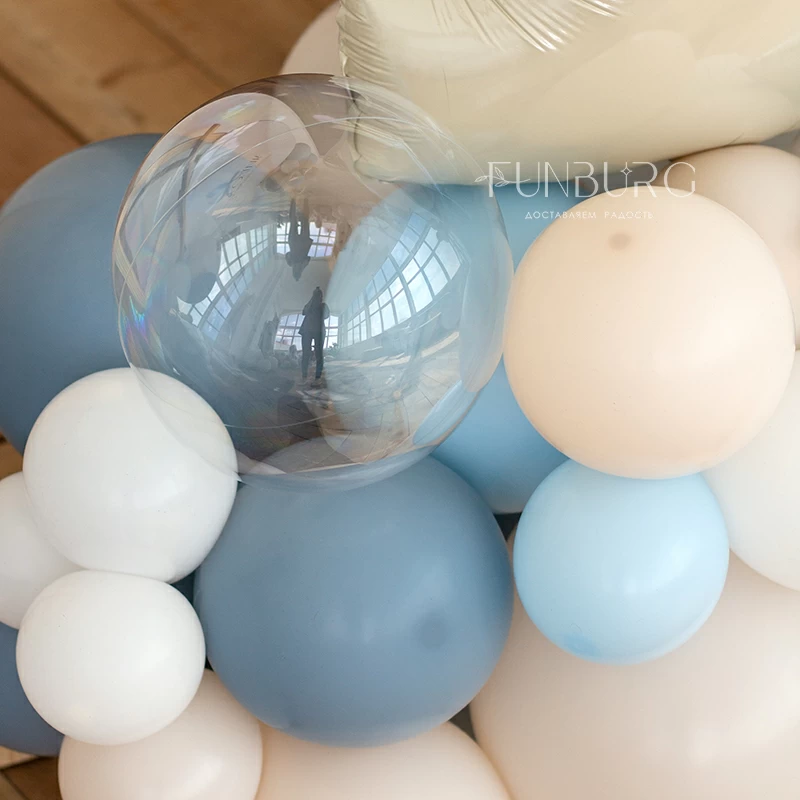 Стильная небольшая фотозона с мольбертом, разнокалиберной гирляндой из шариков мягких оттенков неба, дополненных прозрачными шарами bubble с воздушным фатином внутри, фигурой с кремовой цифрой (она может быть любой) и кругом, на который можно нанести любую надпись, идеально подходит для небольших оформлений, домашних праздников и фотосессий.