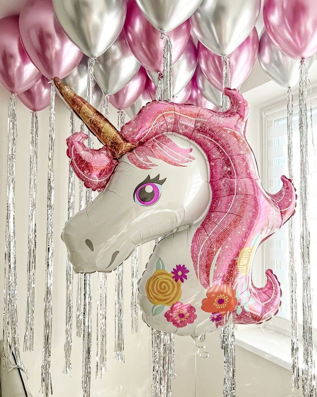 Блистательные шары под потолок с серебряным дождиком и единорогом
