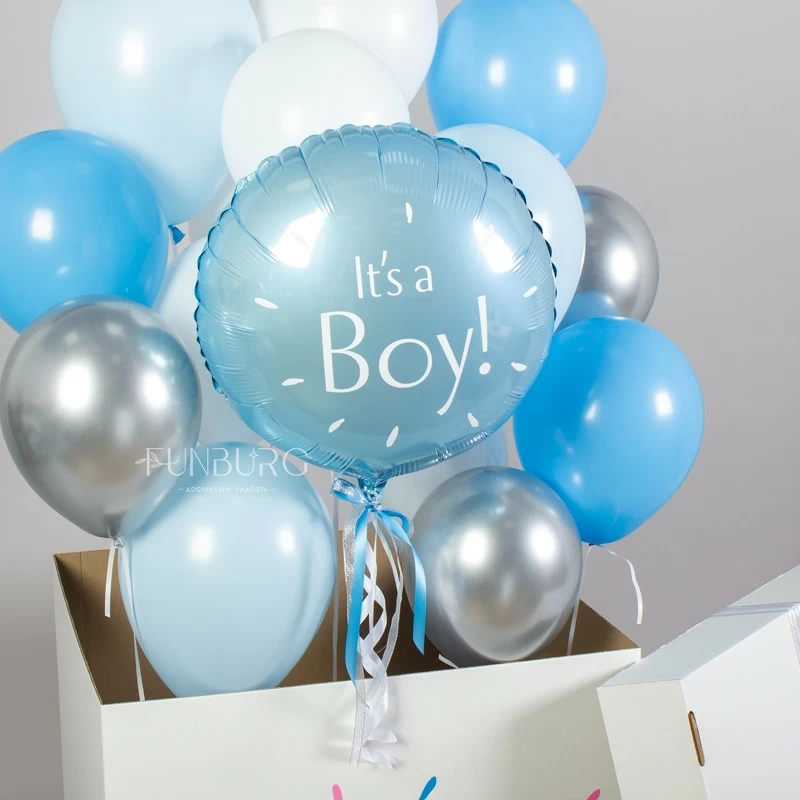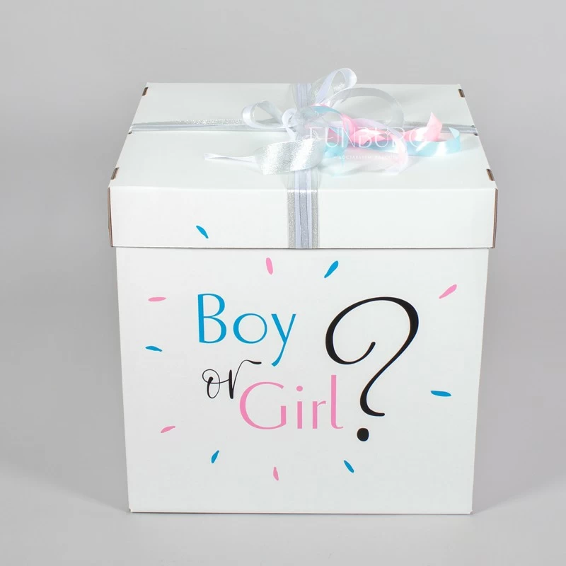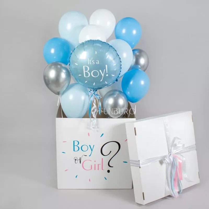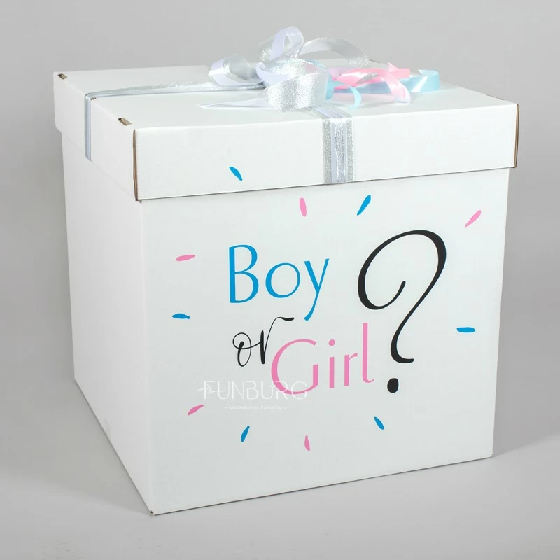 Большая коробка, скрывающая ответ на самый волнующий вопрос: мальчик или девочка? Идеальна для Gender Reveal Party – вечеринки, на которой будущие родители и их близкие узнают пол ребенка, а также для тематической фотосессии. Когда открывается крышка, из коробки вылетает множество маленьких шариков разных оттенков соответствующего цвета и шарик из фольги с ленточками, на котором и написан ответ!