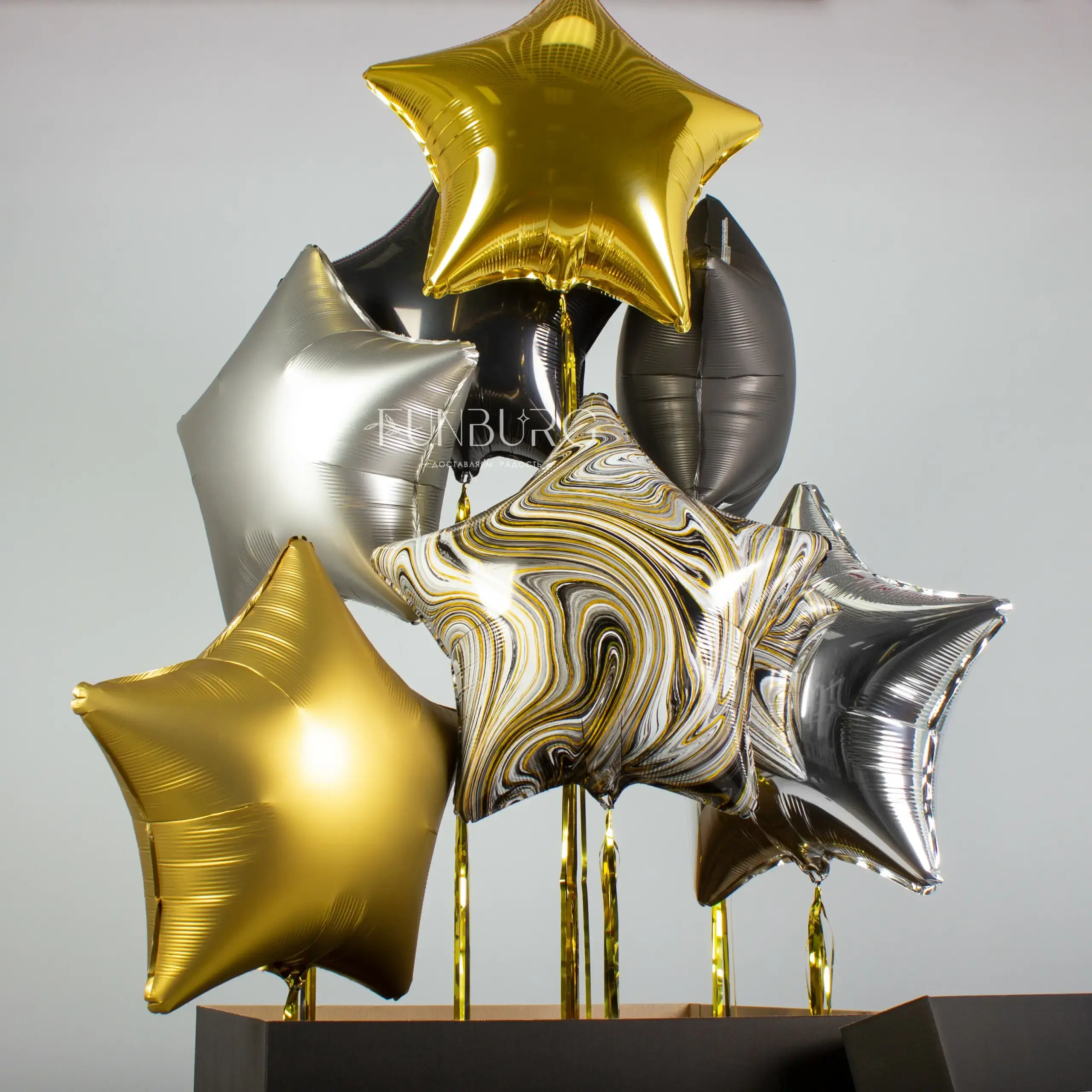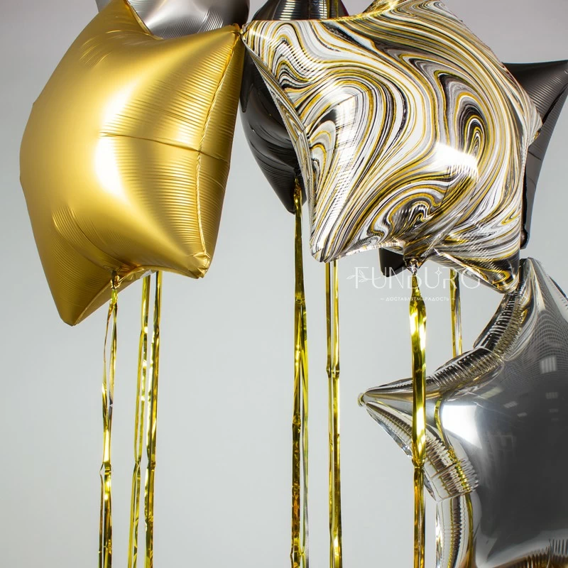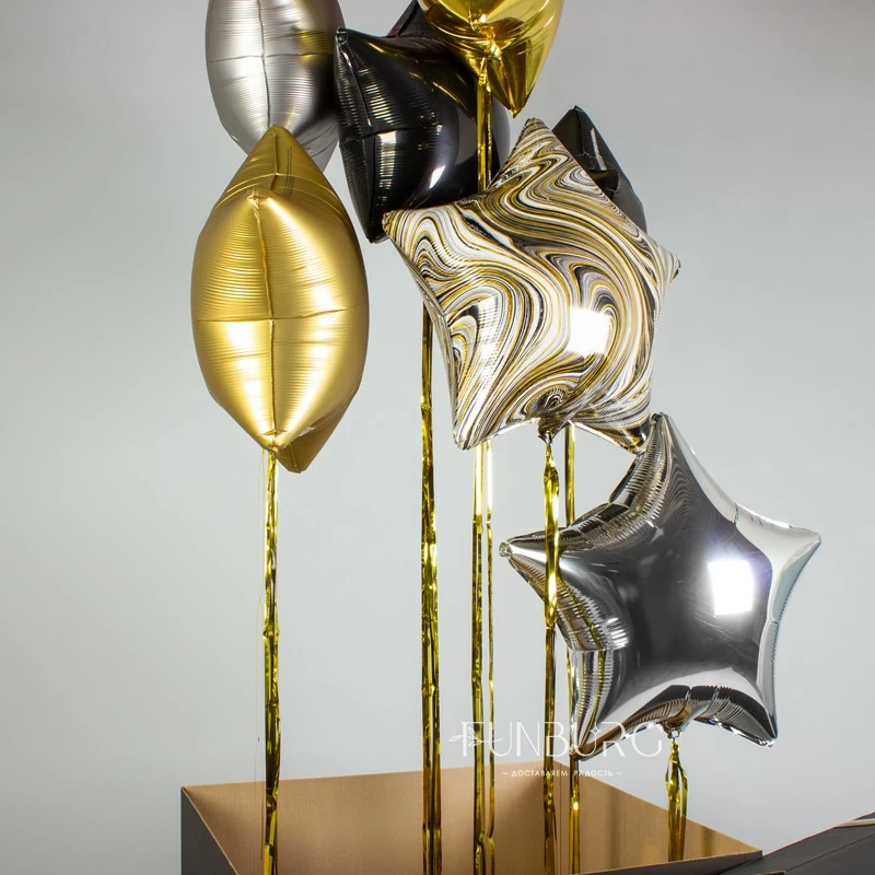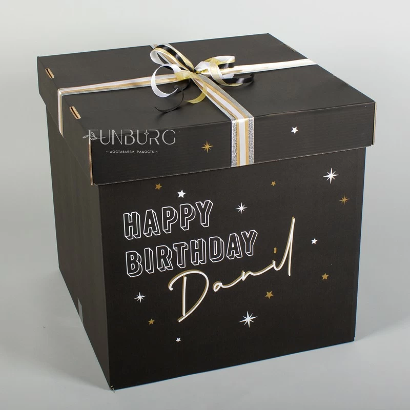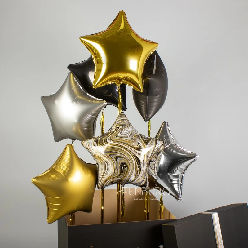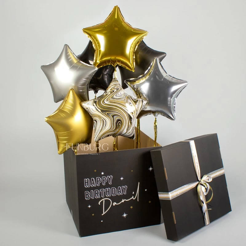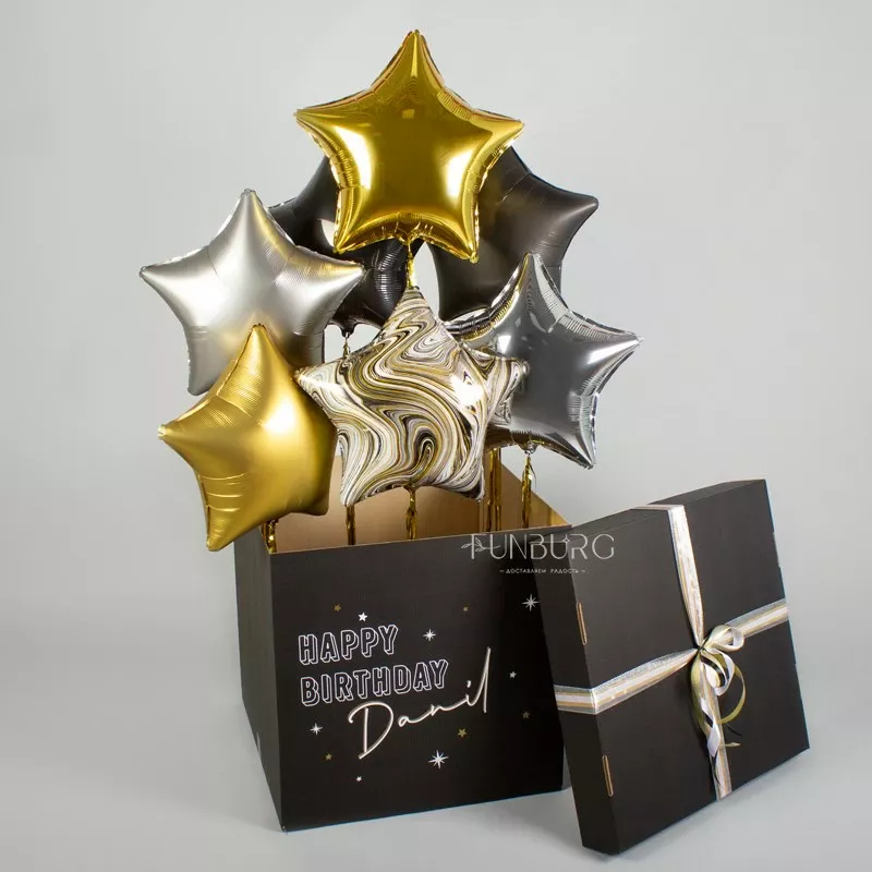 Стильная черная именная коробка, из которой вылетают звезды разных текстур со сверкающими золотыми шлейфами! Такая коробка сама по себе будет отличным подарком, а еще в ней можно спрятать небольшой подарок, который получатель увидит, когда шарики вылетят. А звезды с дождиком, вылетев, станут эффектным украшением праздника!