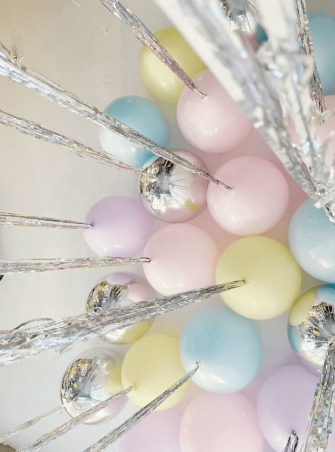 Большие шары макарунс и 3D сферы под потолок с серебряным дождиком 50 штук