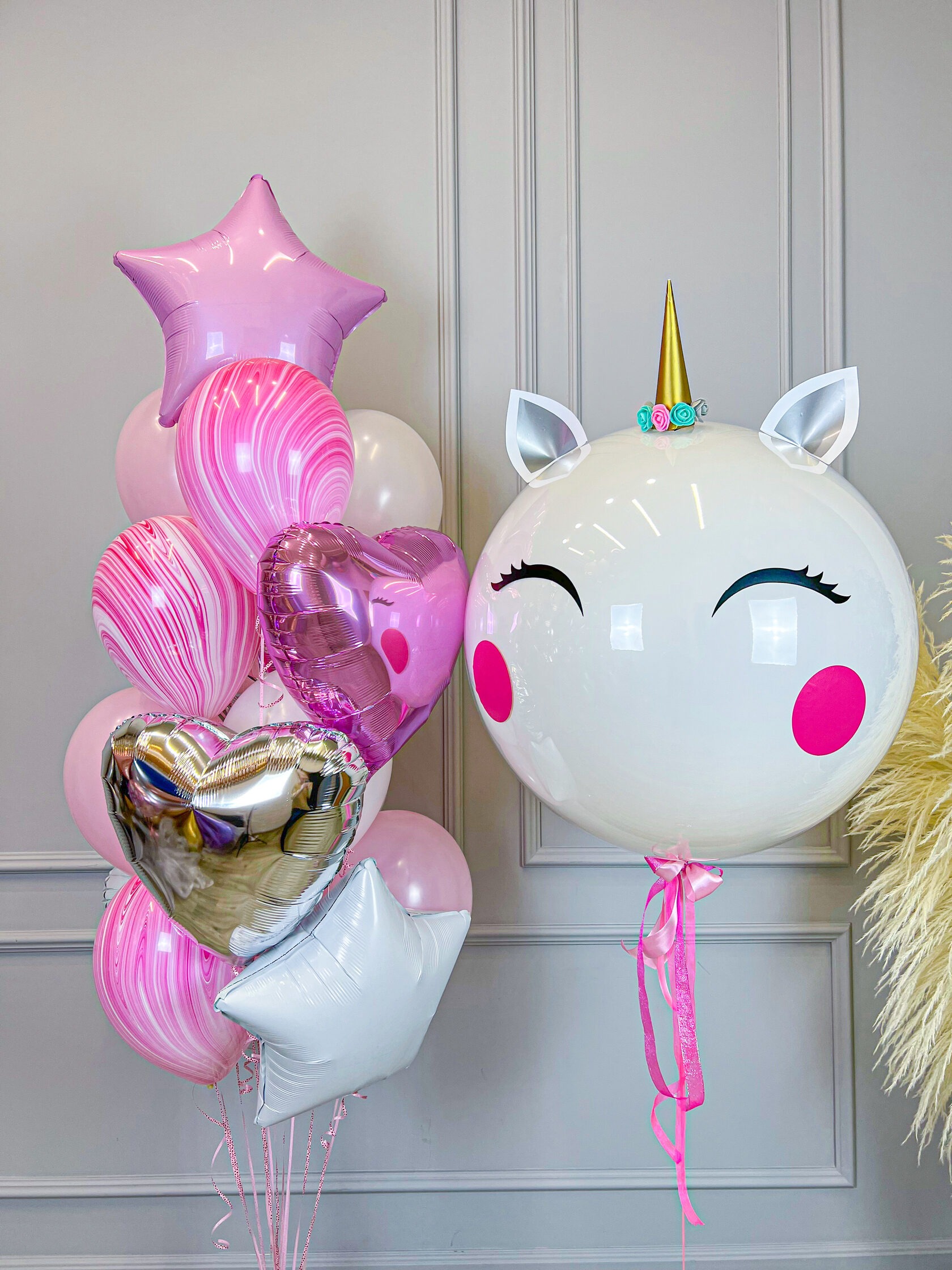 Большой шар-единорог с розовым фонтаном на день рождения