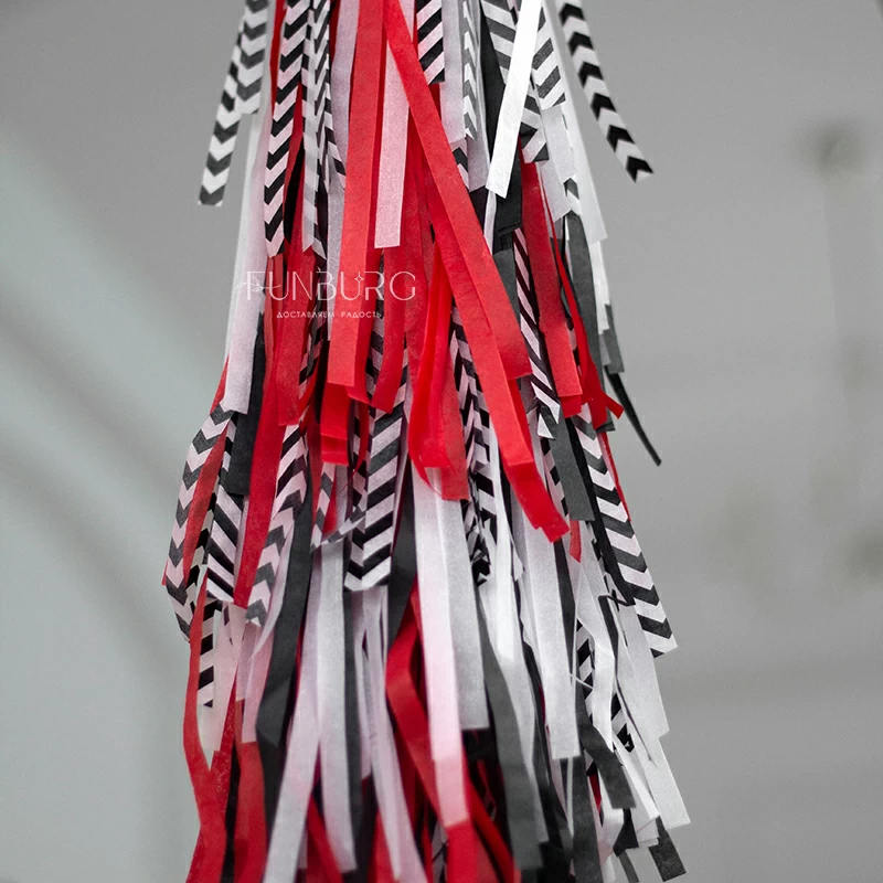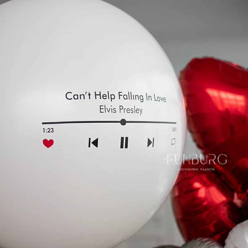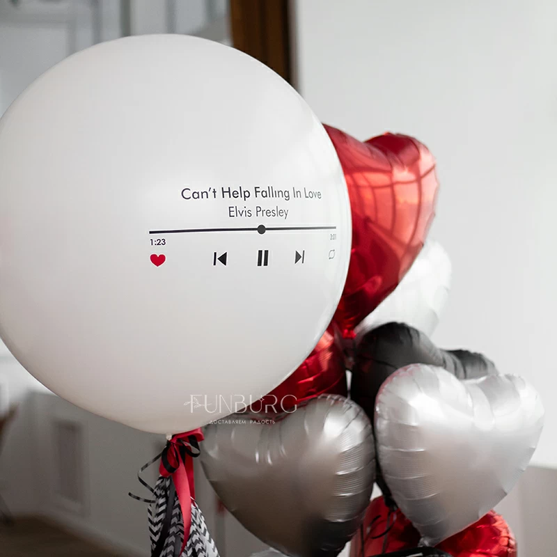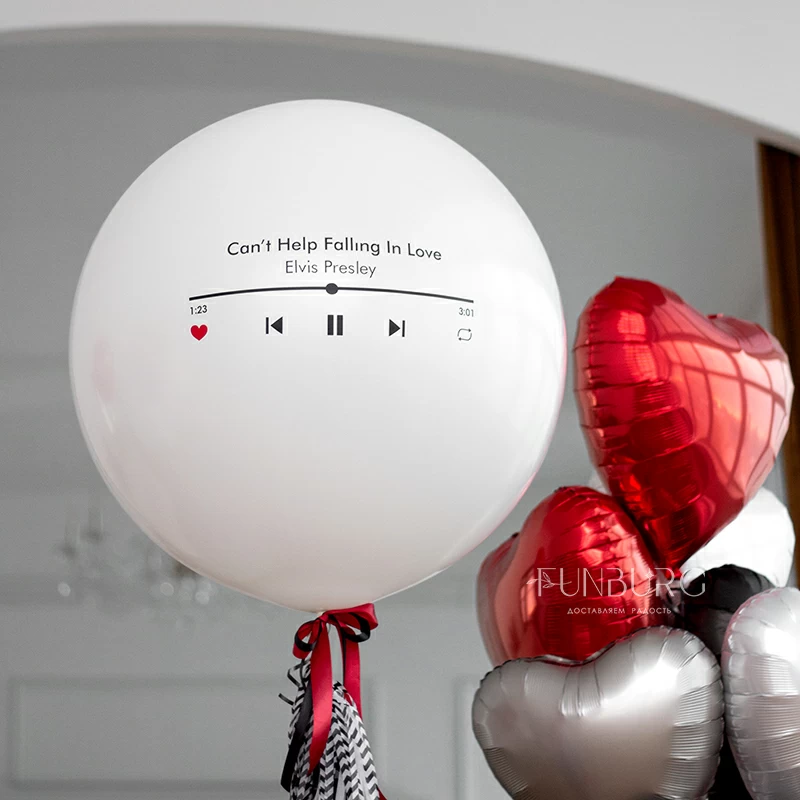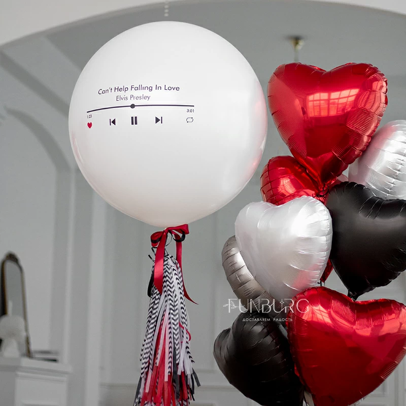 Необычный большой (он немного меньше метрового, при этом не менее эффектный) шар с пушистой тассел-гирляндой и музыкальным плеером с песней (ее мы можем сделать любой) идеален для красивых признаний, подарков на годовщину или другую важную дату, особенно трогательных поздравлений, ведь название песни может быть абсолютно любым: выберите ту, что имеет значение для вас и получателя, и, поверьте, эмоциональный отклик гарантирован!