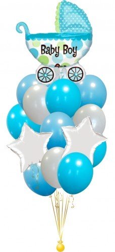 Букет из 12 шаров и фольгированной коляски на выписку мальчику