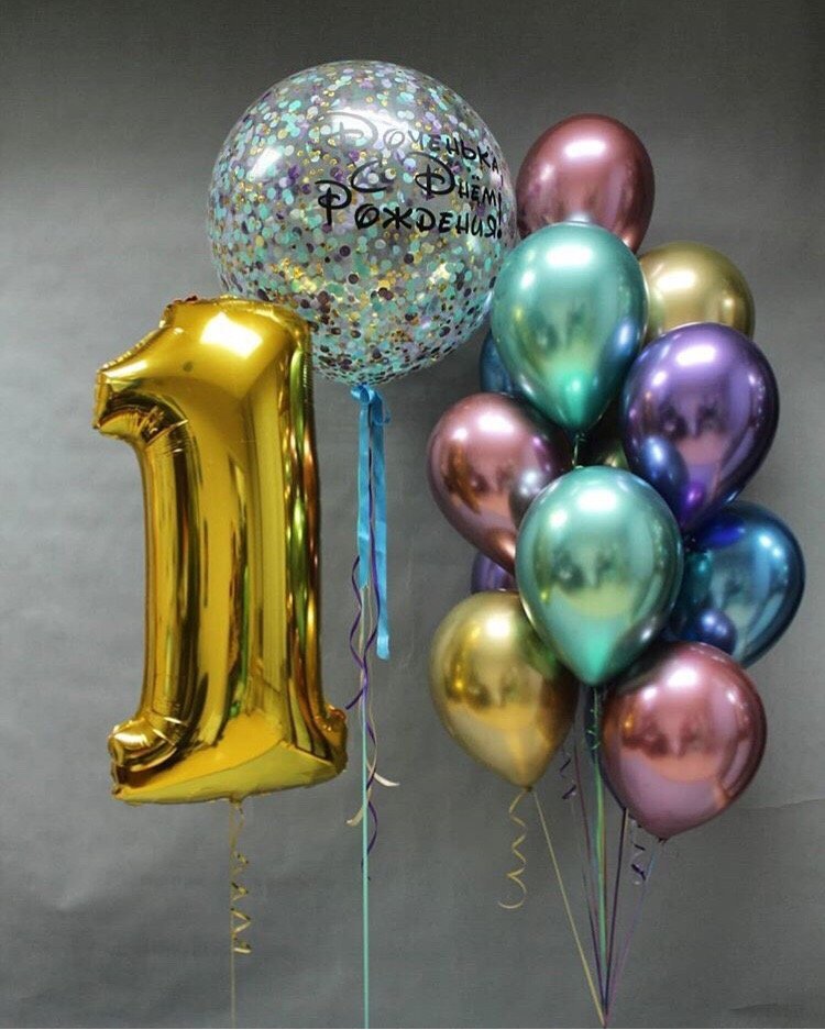 Букет из разноцветных шариков хром, шара с конфетти и цифры