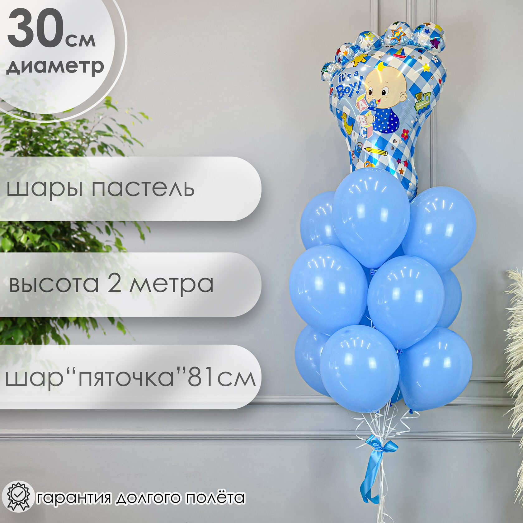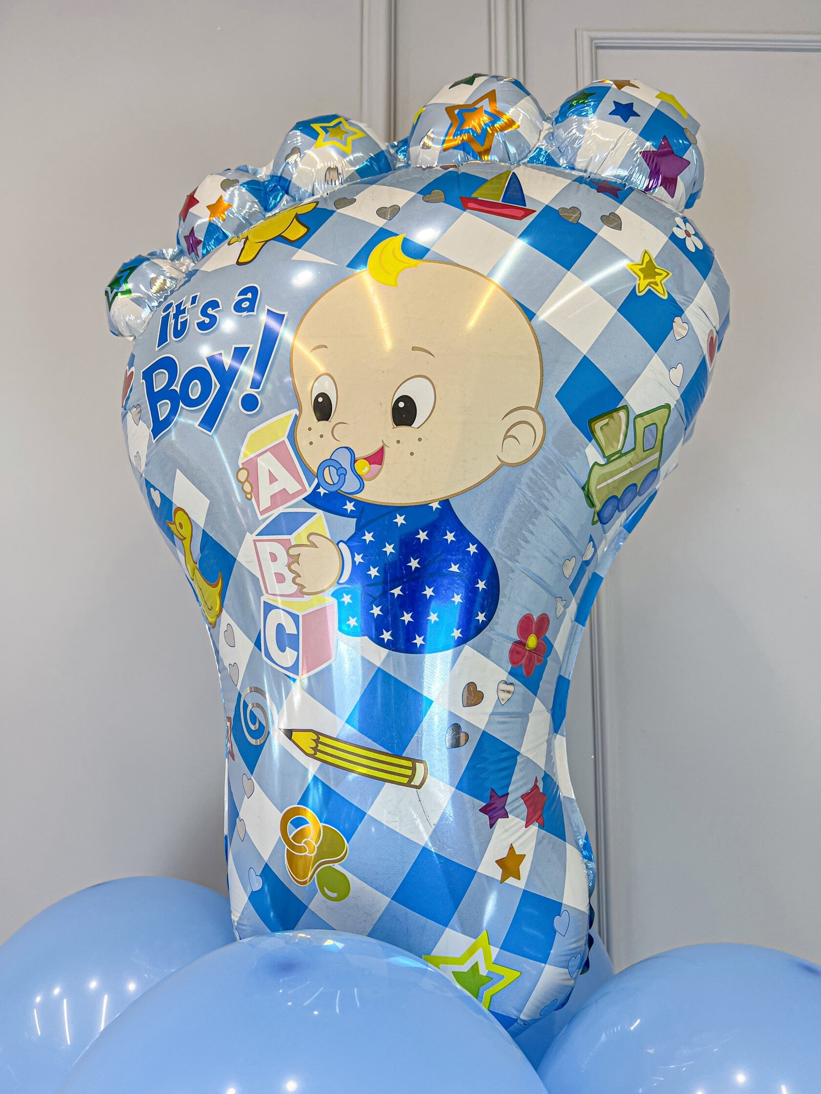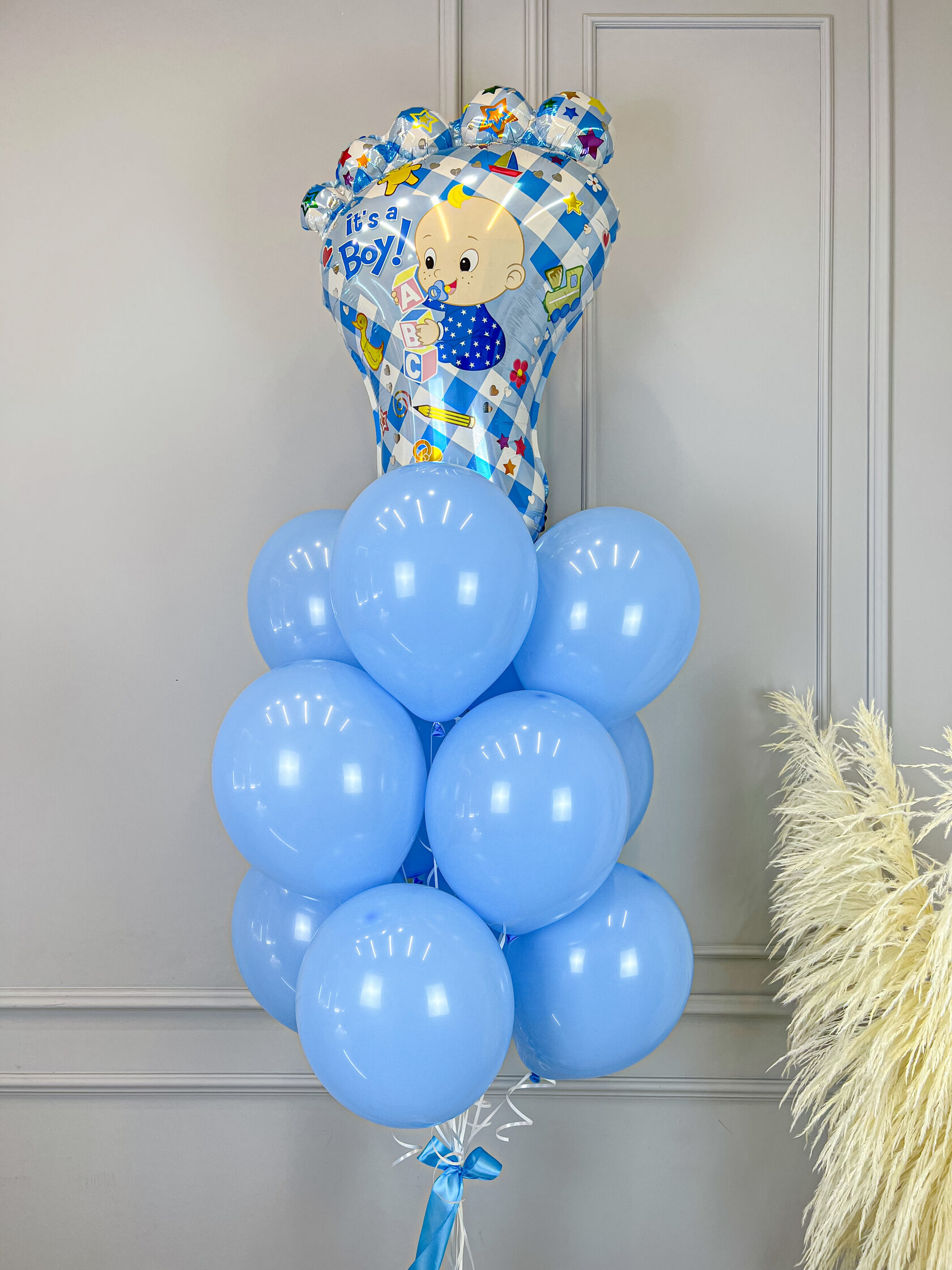 Букет из шаров в нежно-голубой гамме с фольгированной пяточкой малыша