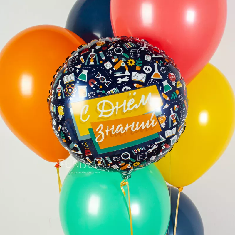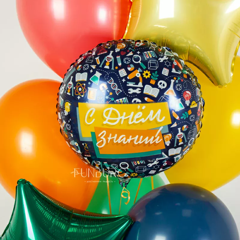 Небольшой яркий букет шаров с тематическим шариком на Первое сентября и звездами в тон рисунков на нем отлично подойдет для украшения Дня знаний.