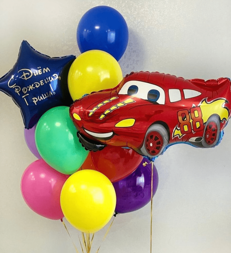 Букет ярких шаров с именной звездой в стиле “Тачки”