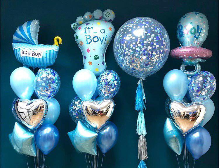 Cет из 3 букетов и с прозрачным шаром с конфетти на выписку для мальчика