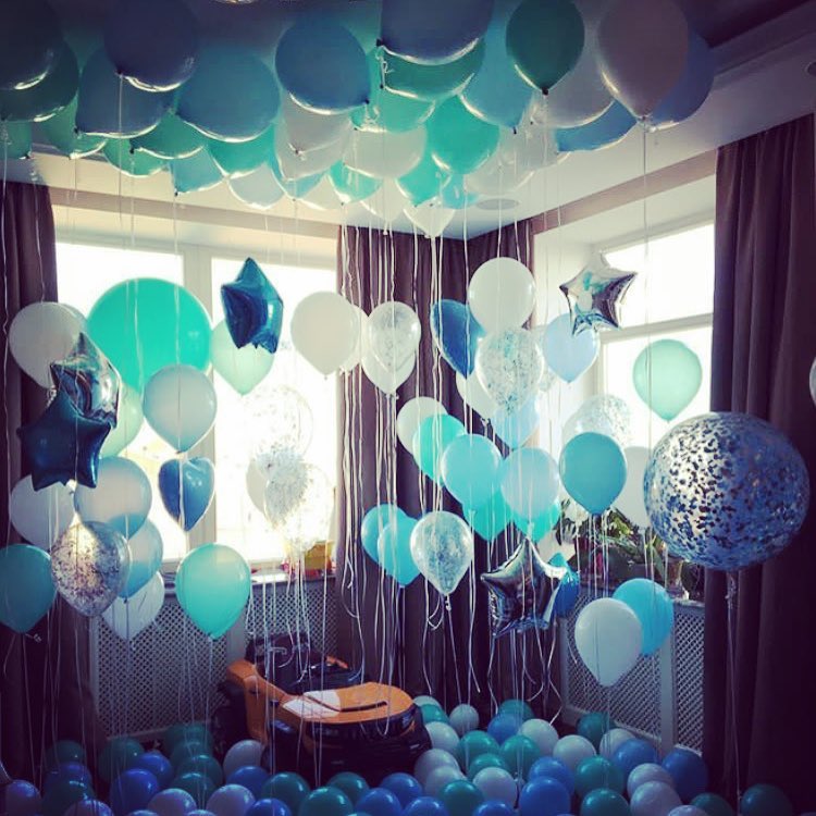 Cет из шаров под потолком и на полу и фольгированными звездами