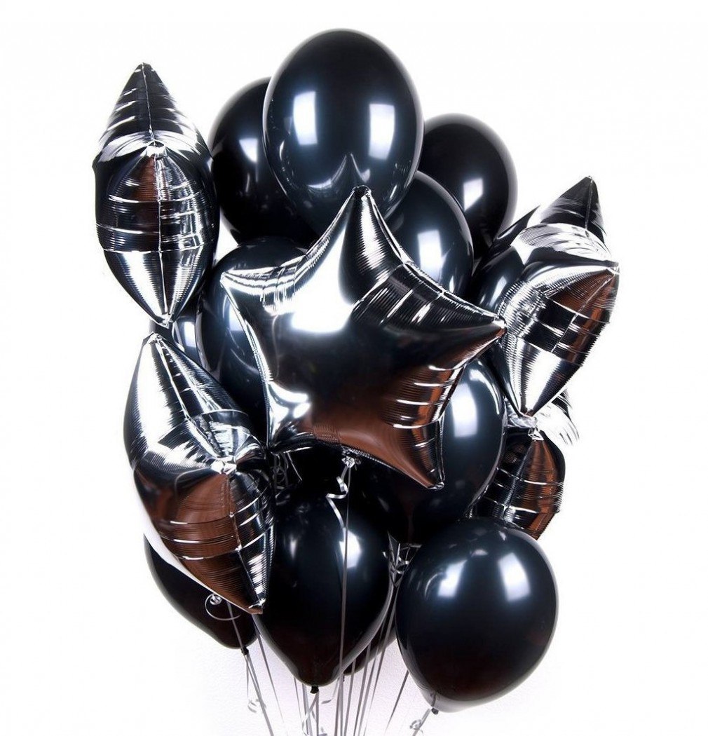 Чёрные матовые шары в букете с фольгированными звёздами на праздник