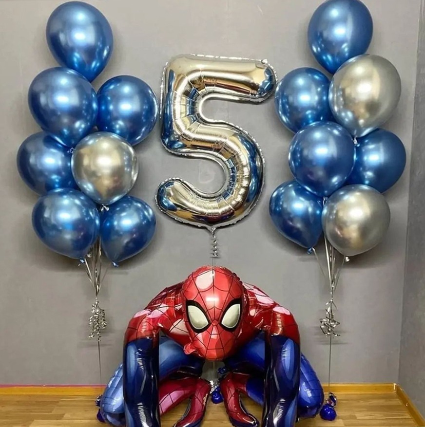 Два фонтана гелиевых шаров хром с цифрой и ростовым шаром “Человек-паук”