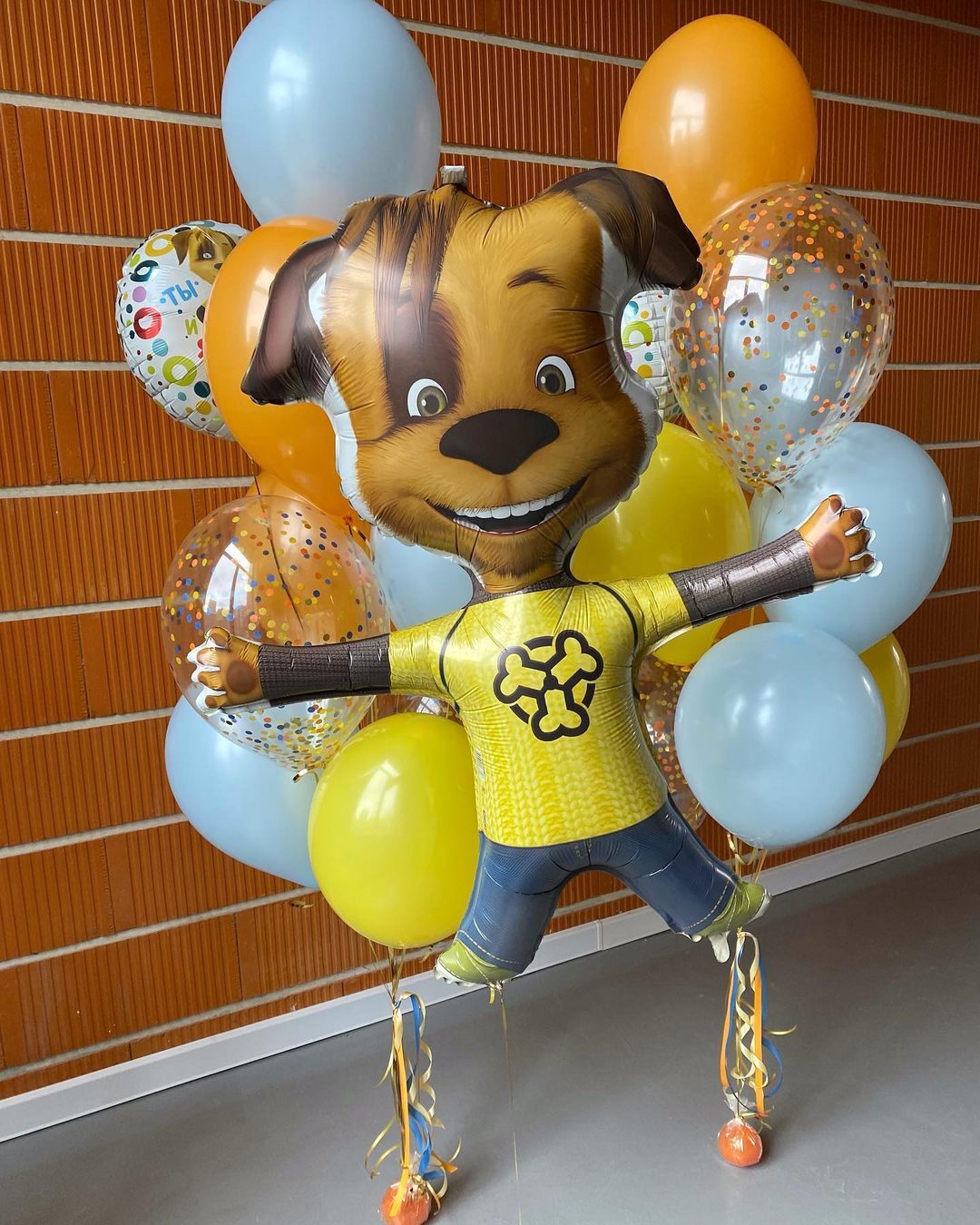 – 2 шара с конфетти (оранжевые/золото/синие круги)
