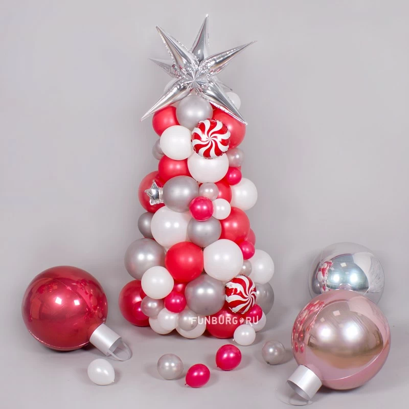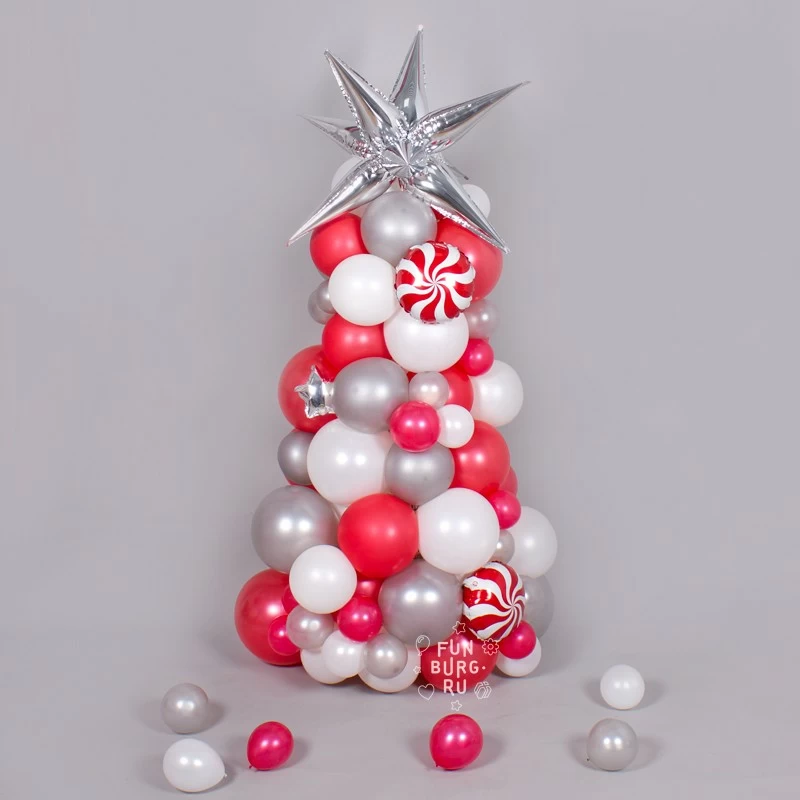 Самый главный атрибут Нового года может быть не только зеленым и с иголками, но и воздушным с карамельками, разнокалиберными шариками и сверкающей звездой с множеством лучиков! Под такой ёлкой обязательно должны появиться самые волшебные подарки! Такую ёлочку можно использовать в качестве альтернативы обычной ели, для декорирования интерьера и создания фотозоны.