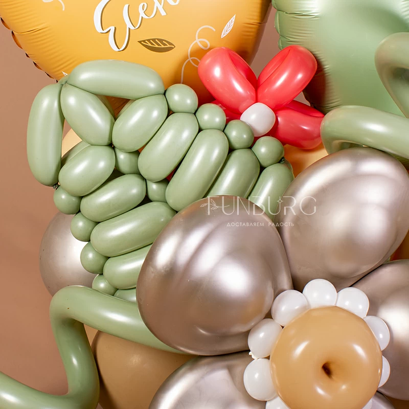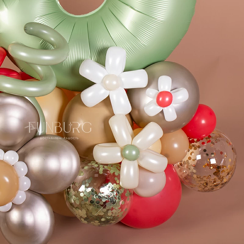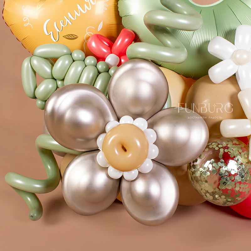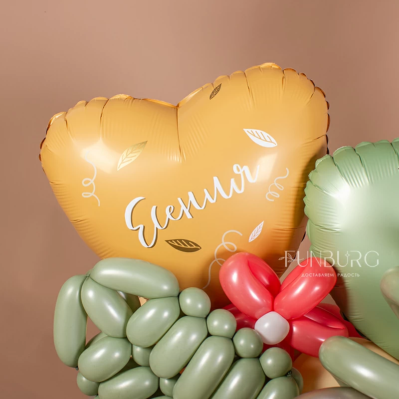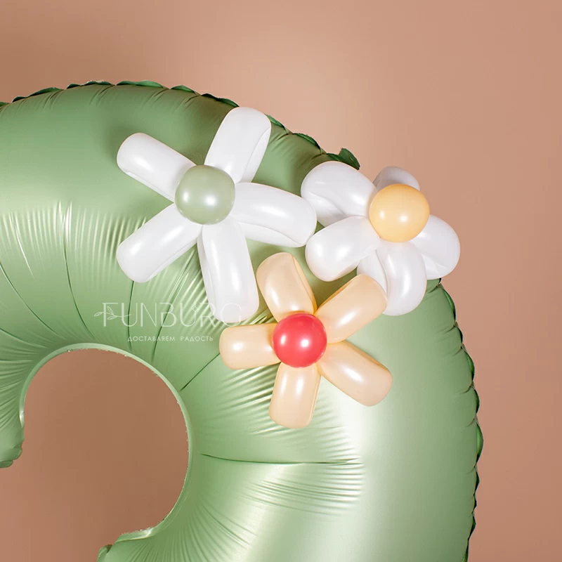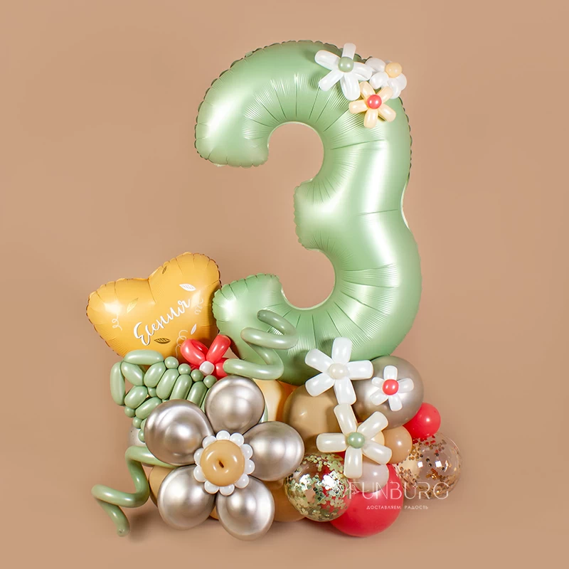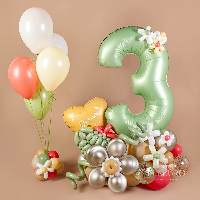Теплое гармоничное сочетание мягких оттенков оливкового, кремового, кораллового, кофе с молоком, цвета шампань и персикового, микс матовых и мягко мерцающих сатиновых текстур, сердце мягкого абрикосового оттенка с надписью (ее можно сделать любой) и декор в виде необычного крупного цветка и маленьких цветочков. Эта летняя, уютная композиция с сатиновой цифрой (она может быть любой) идеально подойдет для детских дней рождения, а если добавить вторую цифру, то может подойти и именинницам постарше.
