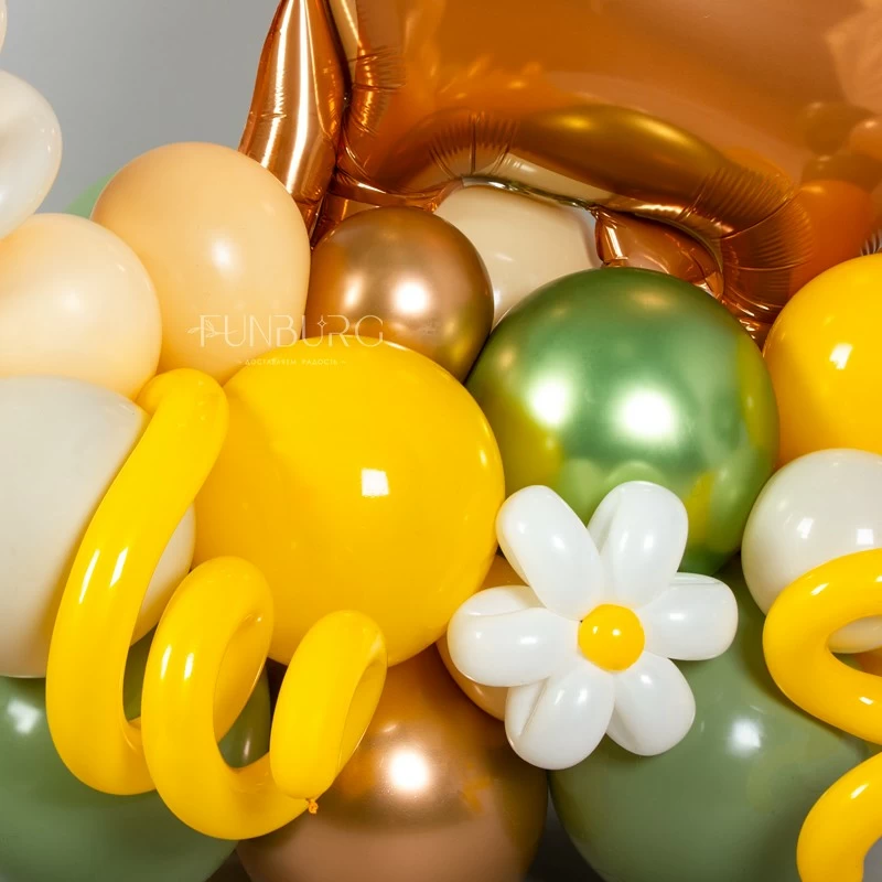Милый оленёнок на разнокалиберном облаке из шариков тёплых природных оттенков может стать как подарком, так и частью оформления детского праздника или фотозоны.