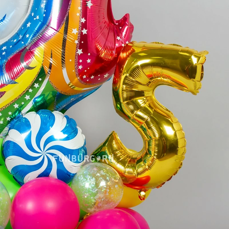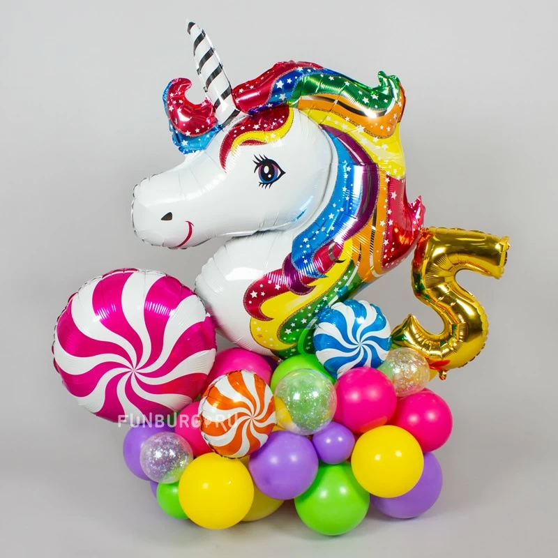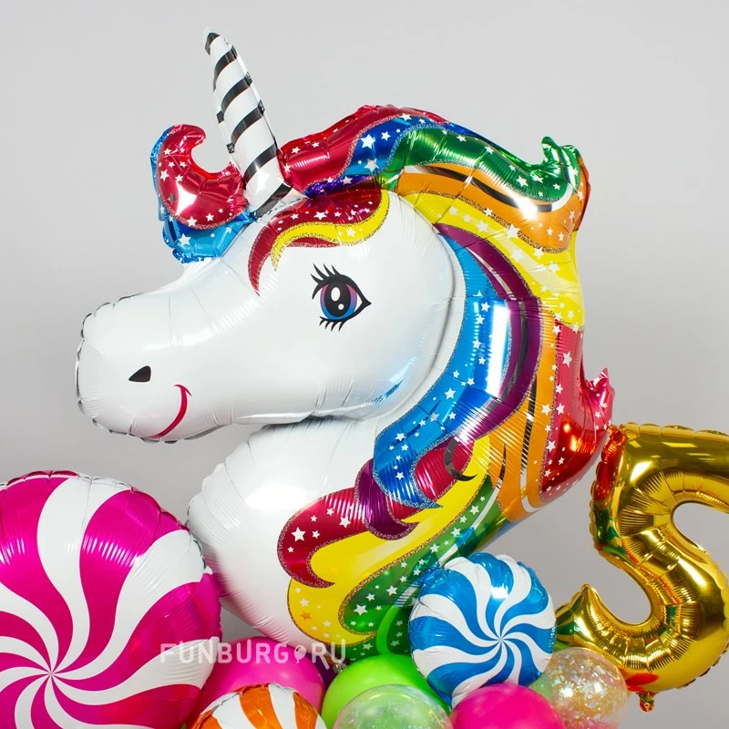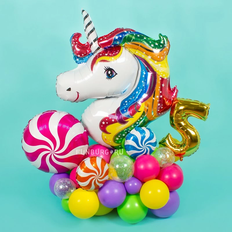 Всеми любимый радужный единорог на разнокалиберной воздушной основе с добавлением большого и маленьких леденцов, сияющих шариков с конфетти и цифры (ее можно сделать любой) станет стильным украшением дня рождения юной принцессы!