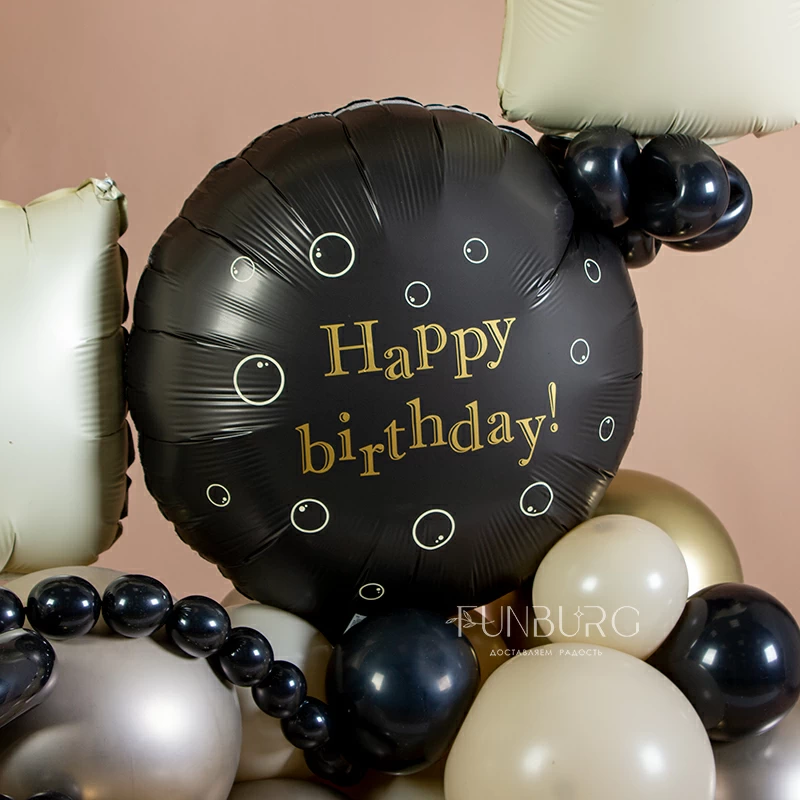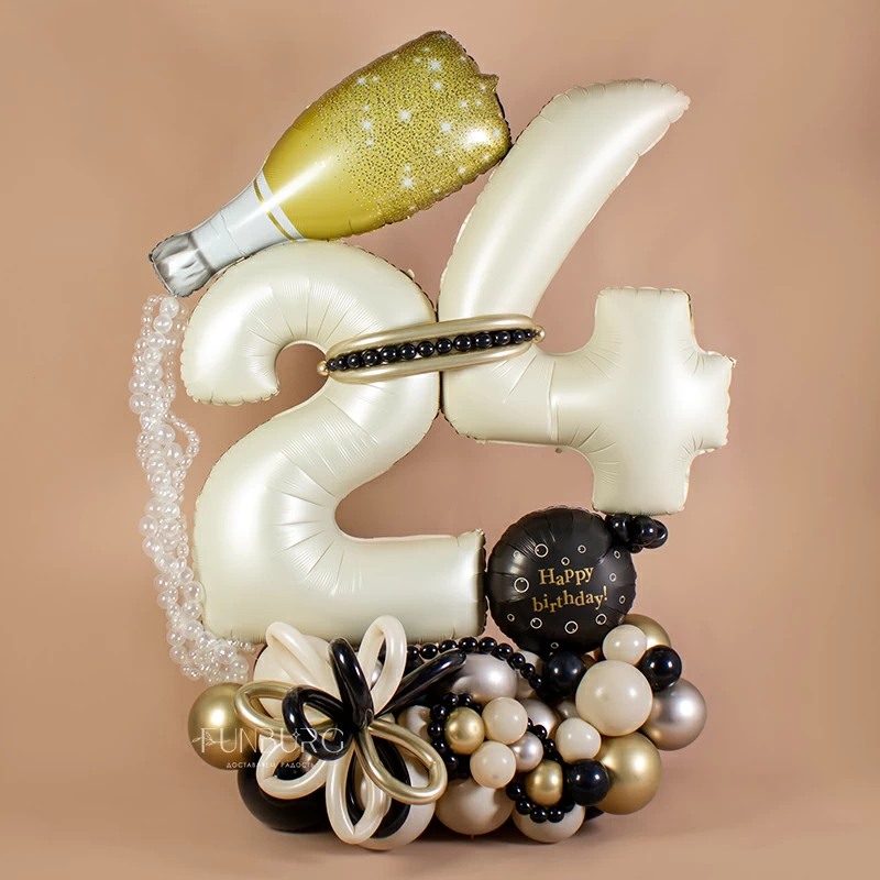 Шар в виде шампанского с пузырьками делает композицию еще более торжественной, а на черном сатиновом круге надпись можно изменить и сделать любой! Цифры и цветовую гамму композиции также можно изменить по вашему желанию.