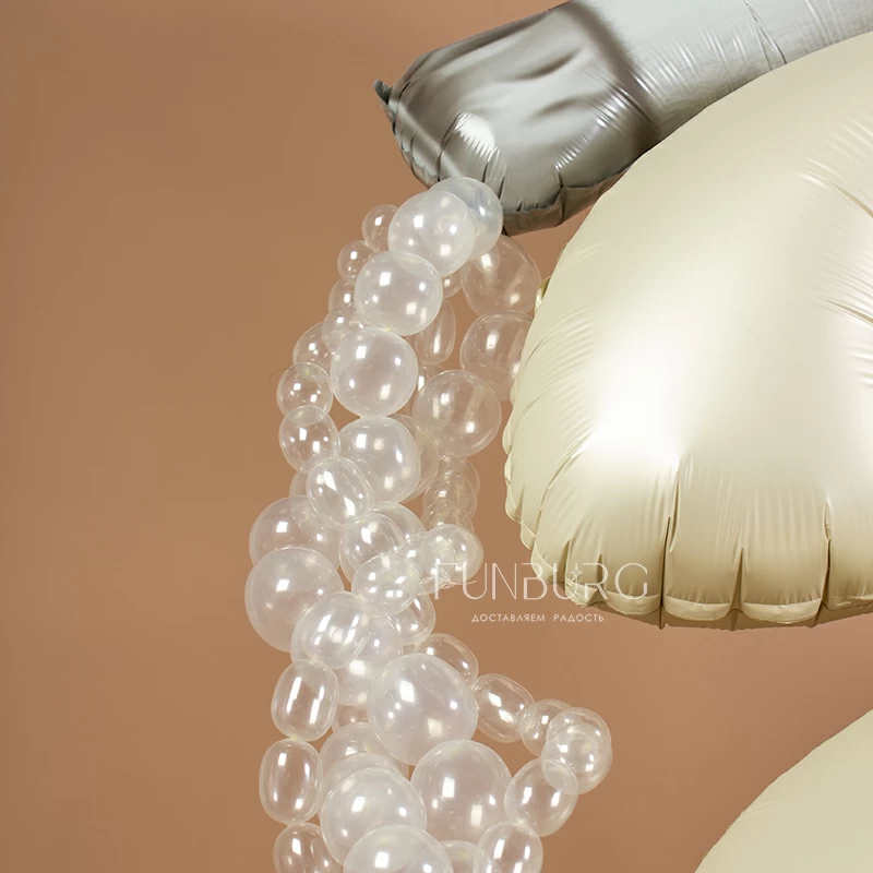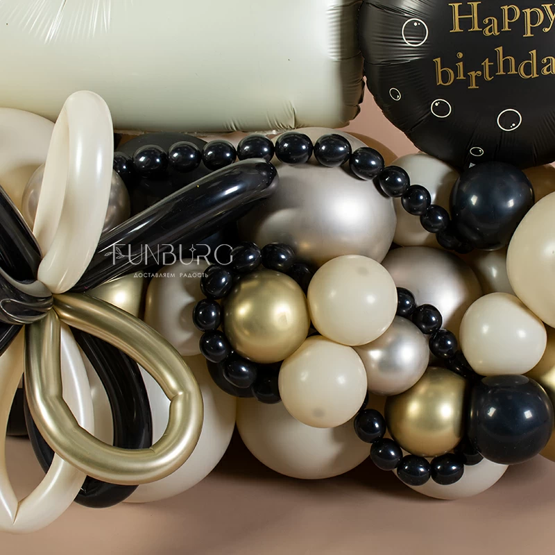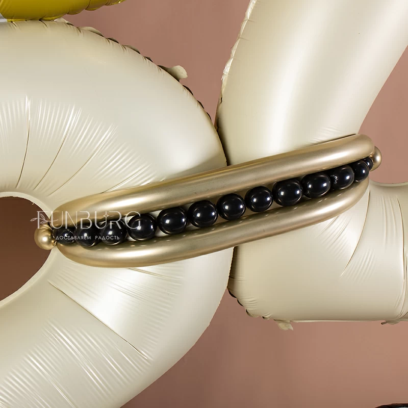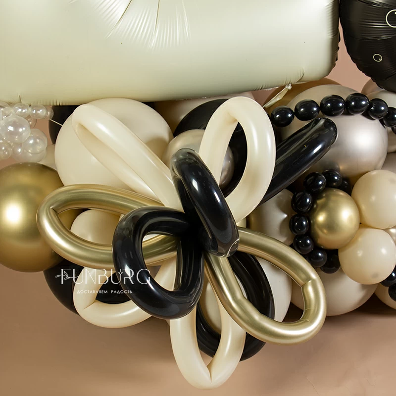 Большая объёмная праздничная фигура в ставшей уже классической гармоничной бежево-черно-золотой гамме с добавлением оттенка шампань идеально подойдет для украшения вечеринки по случаю особенных дат!