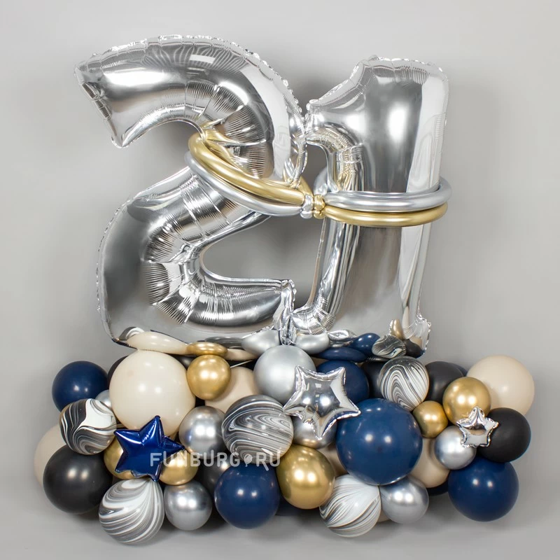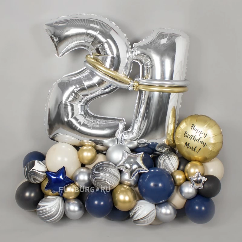 Цветовую гамму композиции, а также цифры и надпись на круглом шаре можно сделать любыми: просто сообщите о желаемых изменениях менеджеру или добавьте комментарий к заказу.