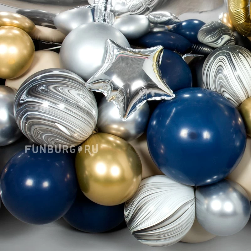 Композиция с цифрами на основе разнокалиберной гирлянды с сияющими шариками Chrome, черно-белыми агатами, звездочками и шариками глубокого синего цвета, дополненная сатиновым золотым кругом с индивидуальной надписью-поздравлением (ее можно сделать любой) украсит как взрослый, так и детский день рождения, а также праздник в честь годовщины или дня основания компании!