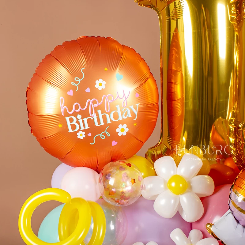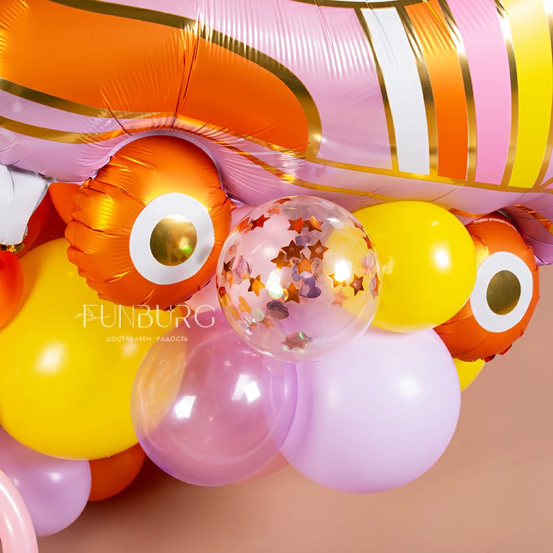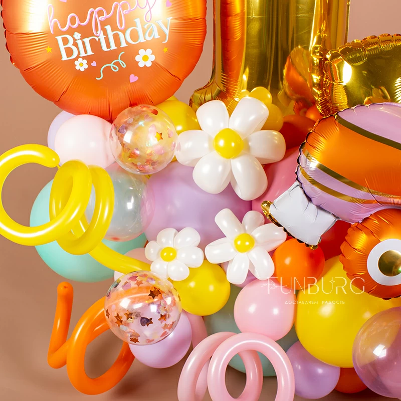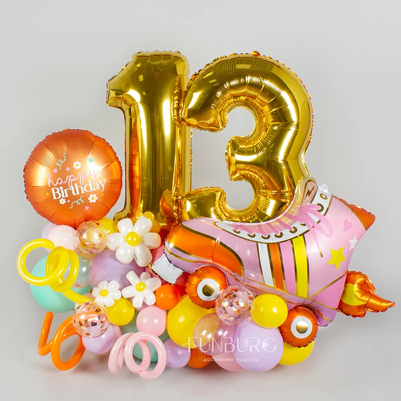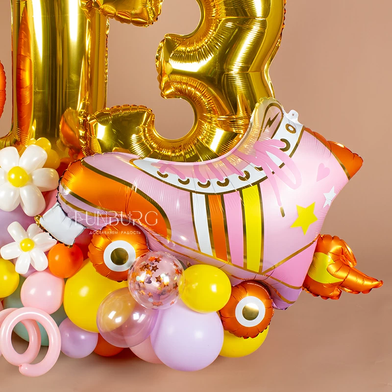Яркая, солнечная и нежная одновременно, фигура с цифрами (они могут быть любыми), кругом и красивым роликовым коньком на основании из разнокалиберного облака из шариков оттенков в духе хиппи создана стать украшением праздника такой же яркой и жизнерадостной девчонки! На сатиновом янтарном круге в тон фигурке надпись можно изменить по вашему желанию: можно просто добавить имя именинницы, а можно придумать свой небольшой текст, который мы оформим в том же стиле.