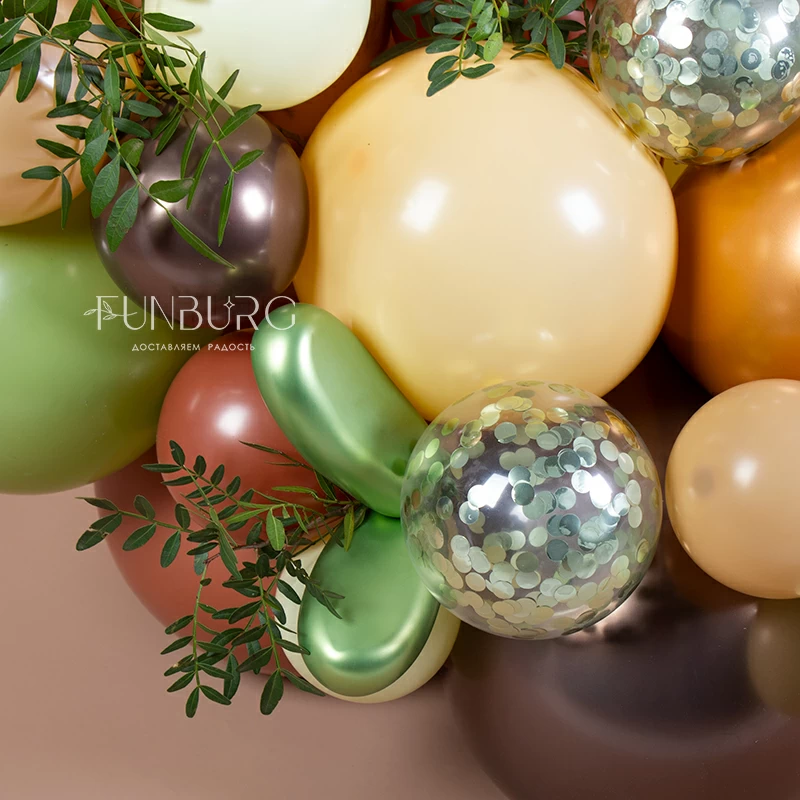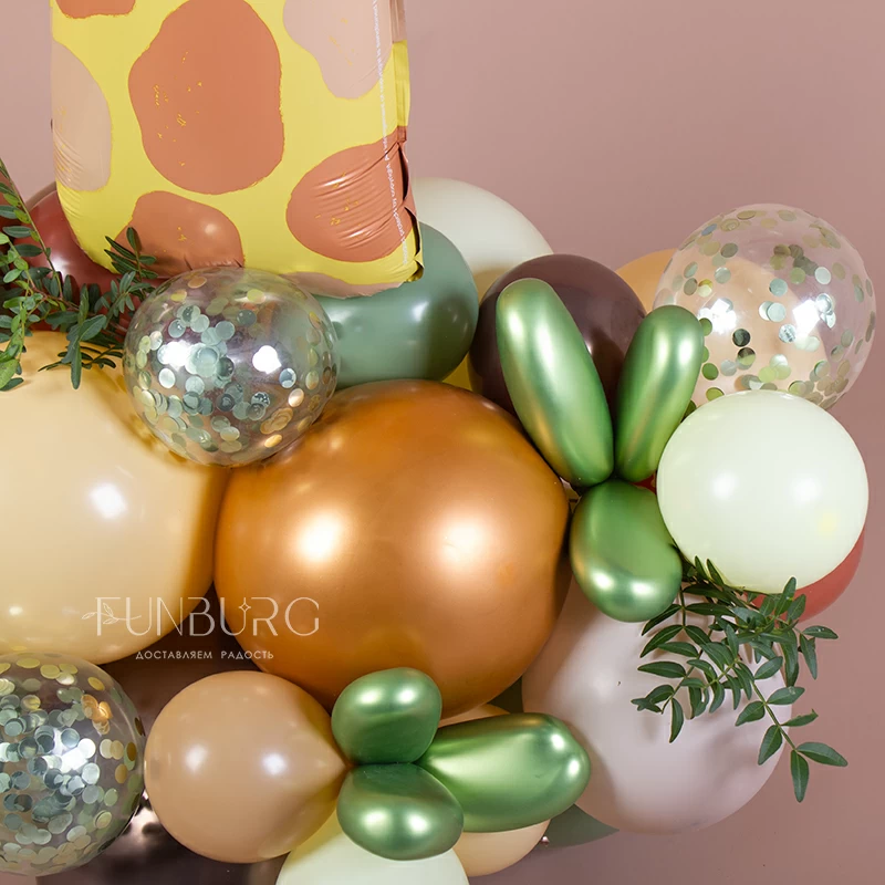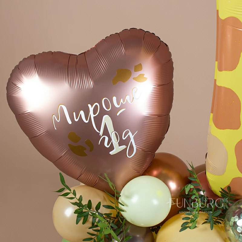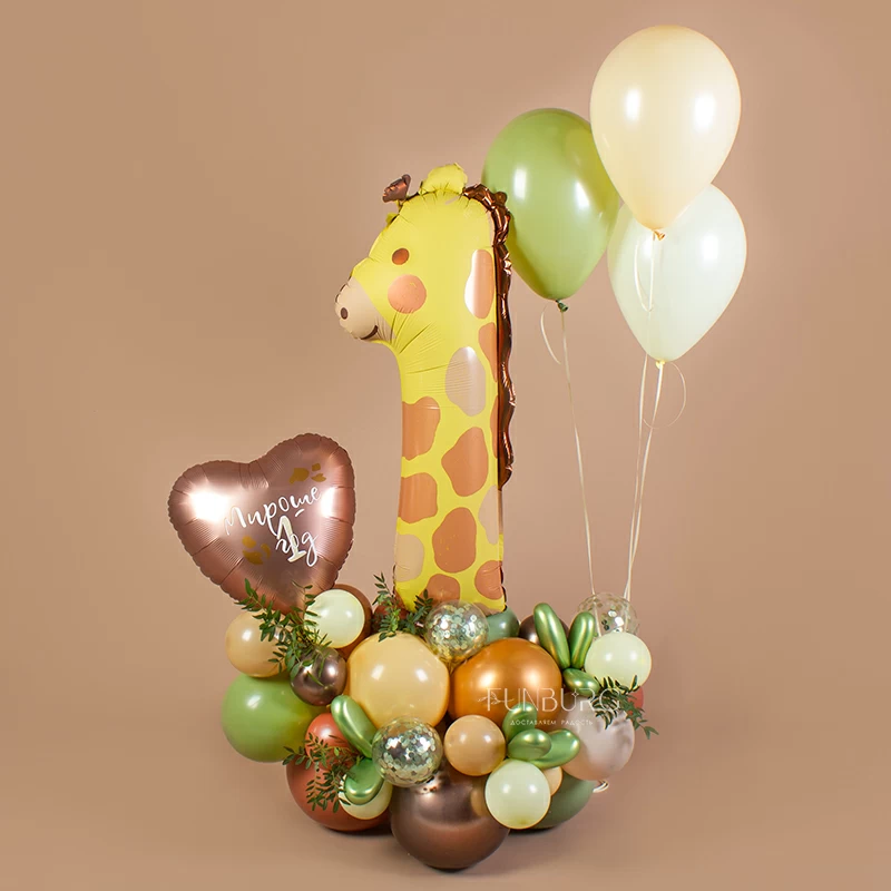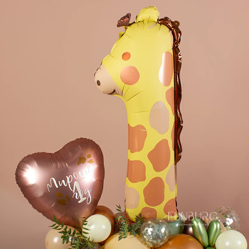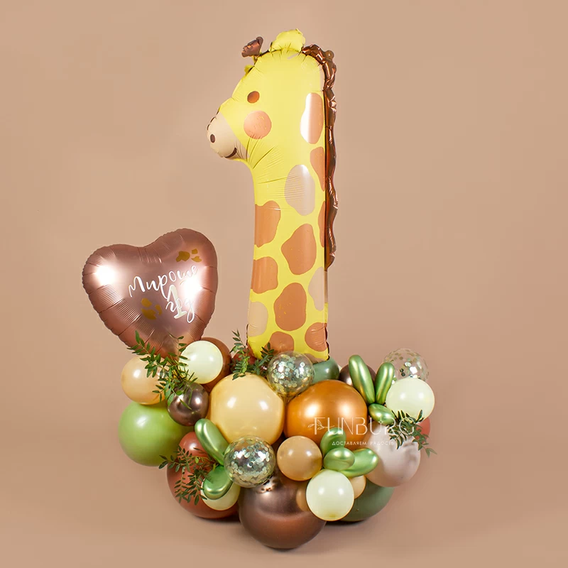 Очаровательная цифра в виде жирафика на подставке красивых природных цветов, украшенной настоящими веточками фисташки и сердцем с надписью (ее можно сделать любой). Для самых стильных первых дней рождения! Фигурка отлично подойдет для памятных фотографий с малышом, станет частью фотозоны. Ее можно дополнить фонтанами из шариков в такой же гамме.