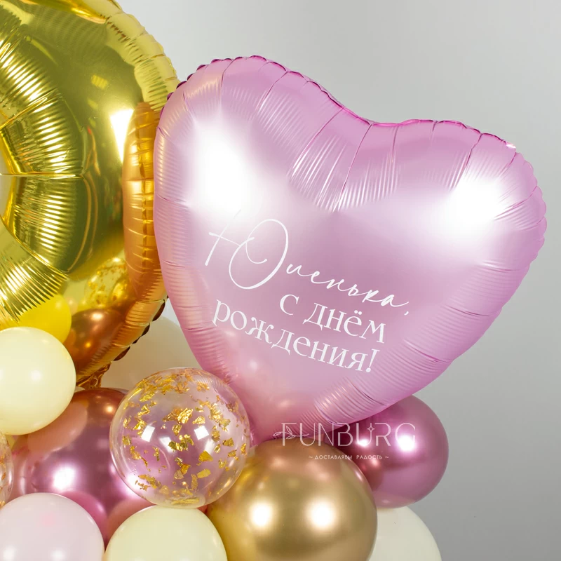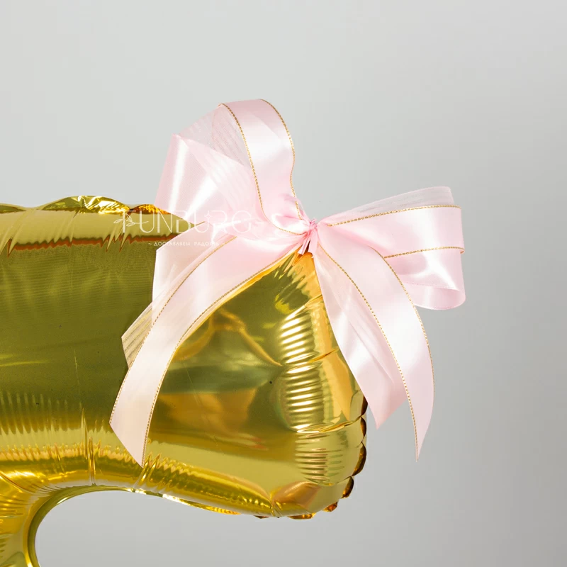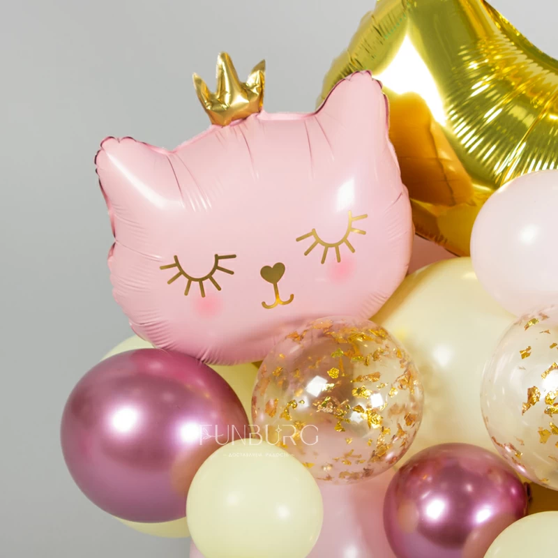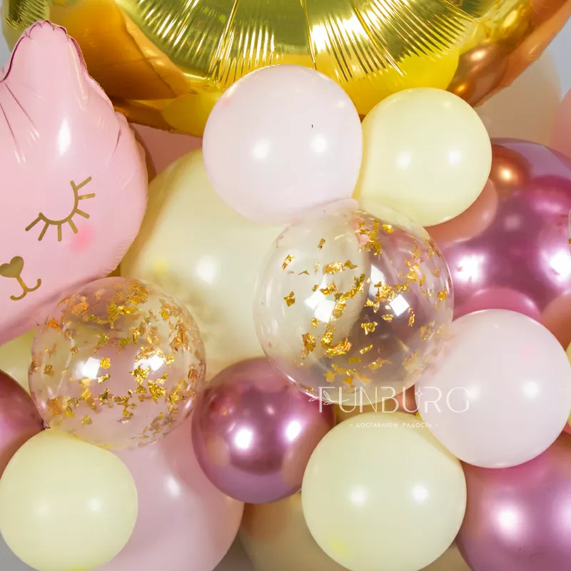 Золотистая цифра на облаке из шариков нежных оттенков с добавлением мерцающих шариков Chrome, с очаровательным котёнком и сатиновым сердцем с надписью.