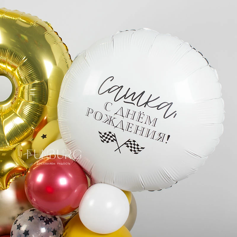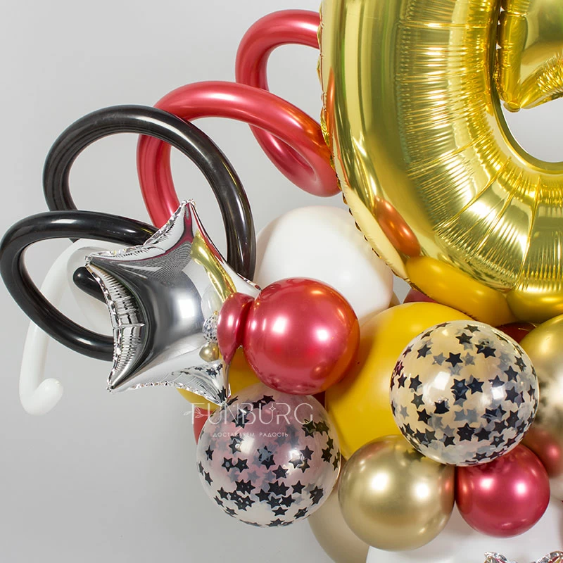 Фигура с цифрой и кругом с надписью, дополненная завитушками, шариками Сhrome и шарами с конфетти-звездочками, идеально дополняющая одноименный набор шаров с эффектным ретро-автомобилем.
