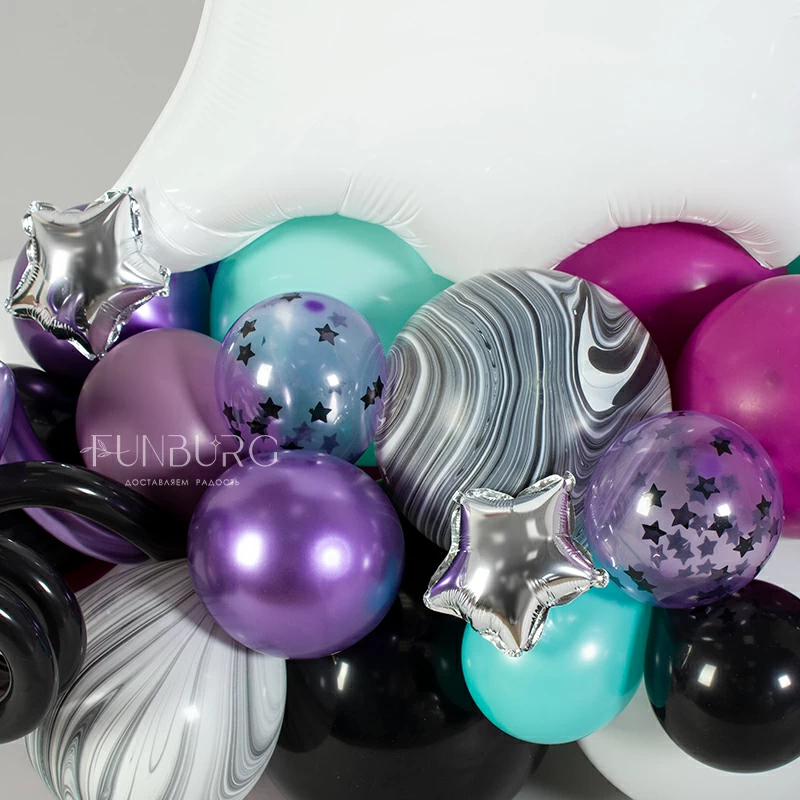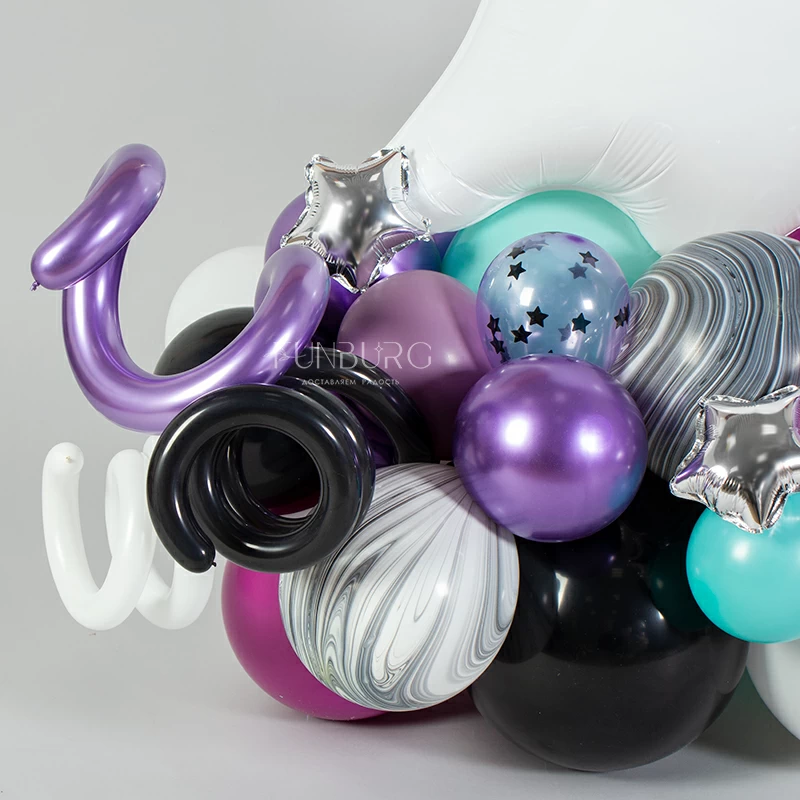 Милое загадочное привидение на облаке из разнокалиберных шариков лиловых, дымно-черных, мятных оттенков, с надписью на сатиновом круге (она может быть любой) станет стильным и красивым украшением Хэллоуина и основой для небольшой фотозоны.