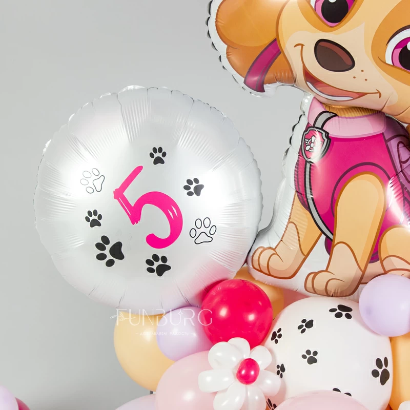 Композиция с очаровательной Скай на воздушном основании из разнокалиберных шариков, украшенном цветочками и шарами с отпечатками лапок, дополненном сатиновым кругом с цифрой и лапками (но цифру можно заменить на любую надпись). Идеальный подарок для маленькой любительницы мультика «Щенячий патруль» и для украшения тематического праздника или фотозоны.