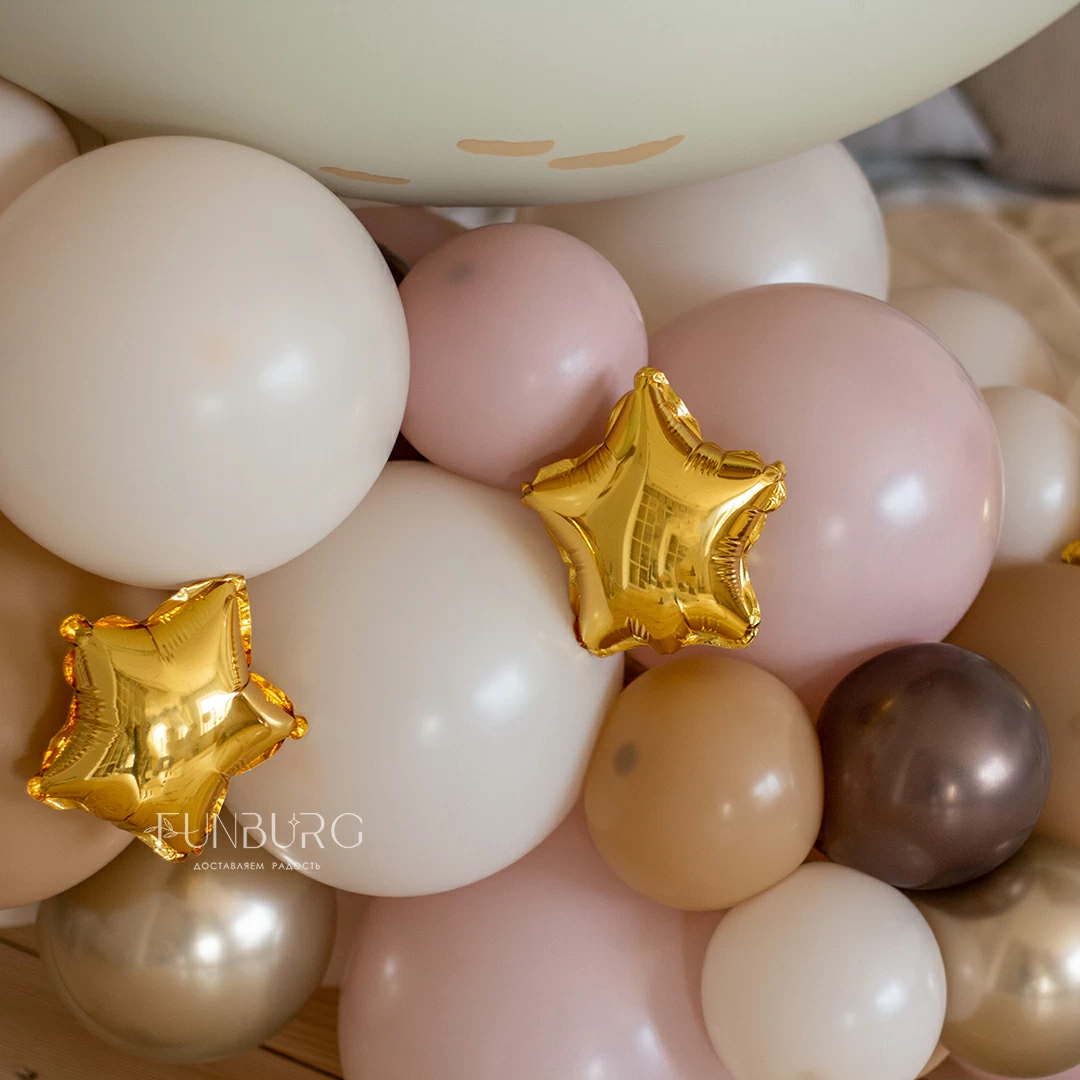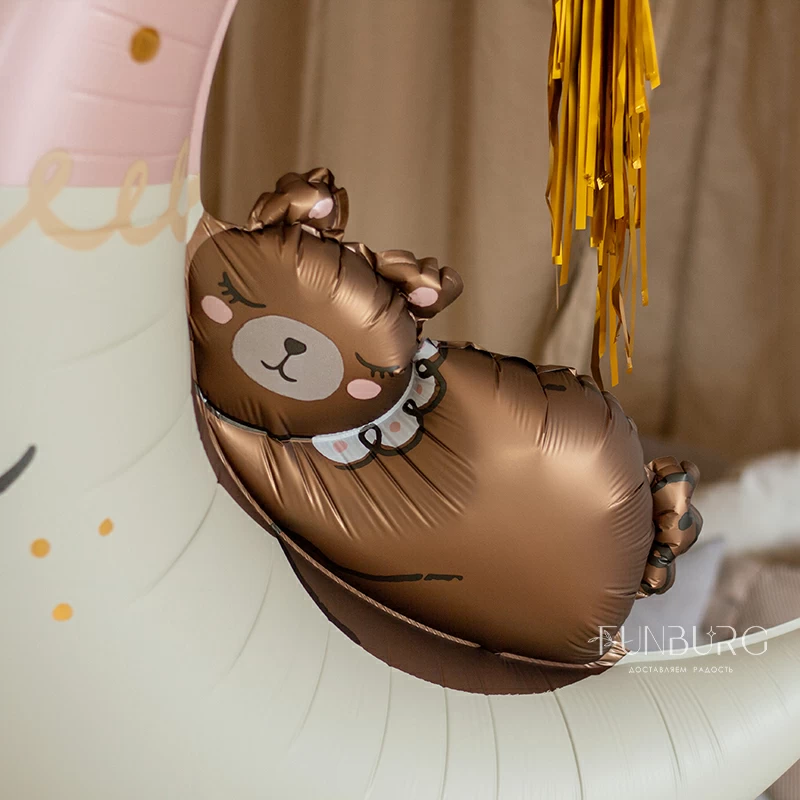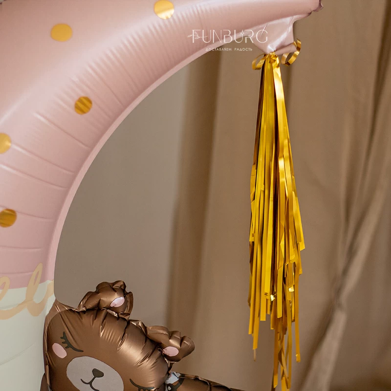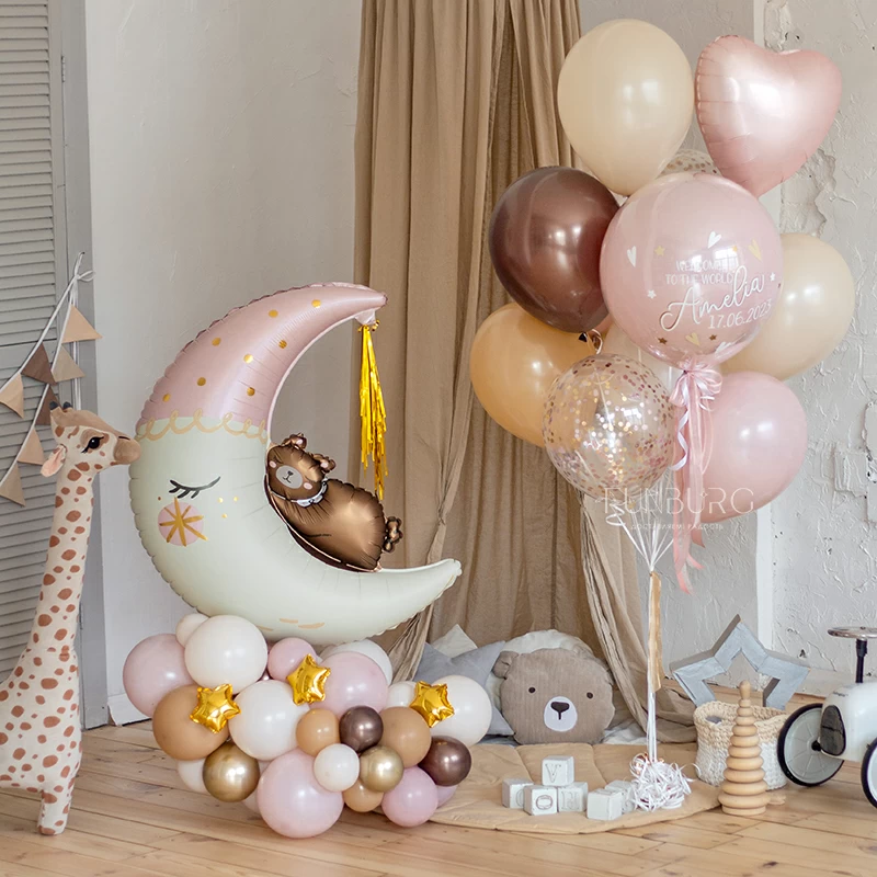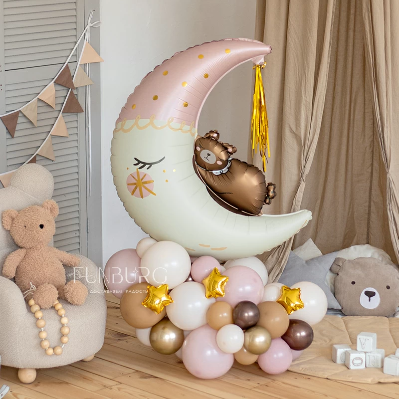 Нежная фигура из шаров с месяцем и спящим мишкой как нельзя кстати придется для украшения детской для встречи малыша, а также отлично подойдет для первых дней рождения и самых трогательных событий. Фигуру можно дополнить связками шариков в тон и, например, большим шаром с метрикой (или поздравлением, ведь надпись может быть любой).