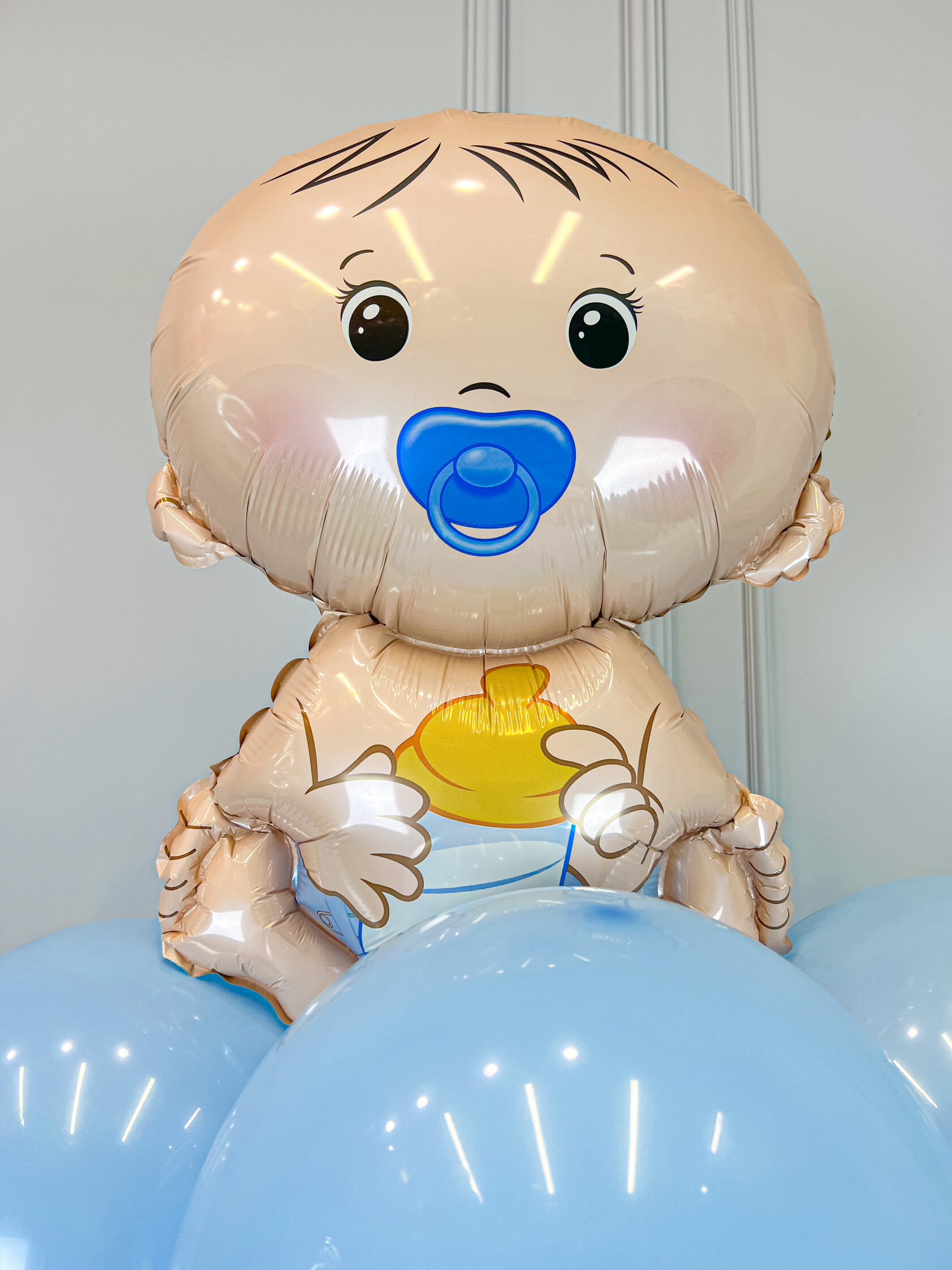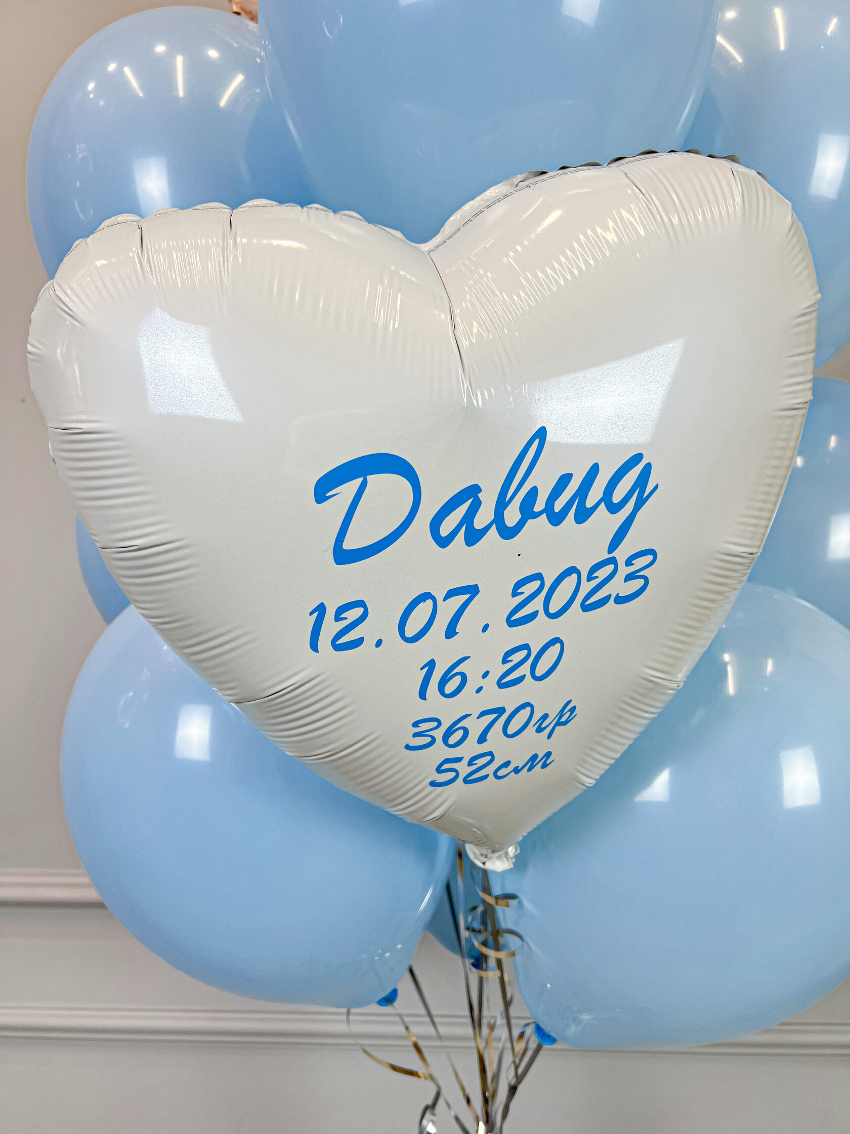 Фонтан из шаров в голубом цвете с метрикой на сердце