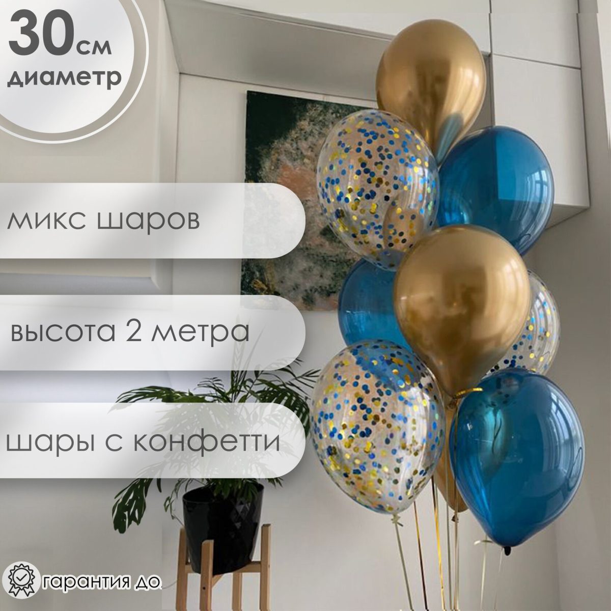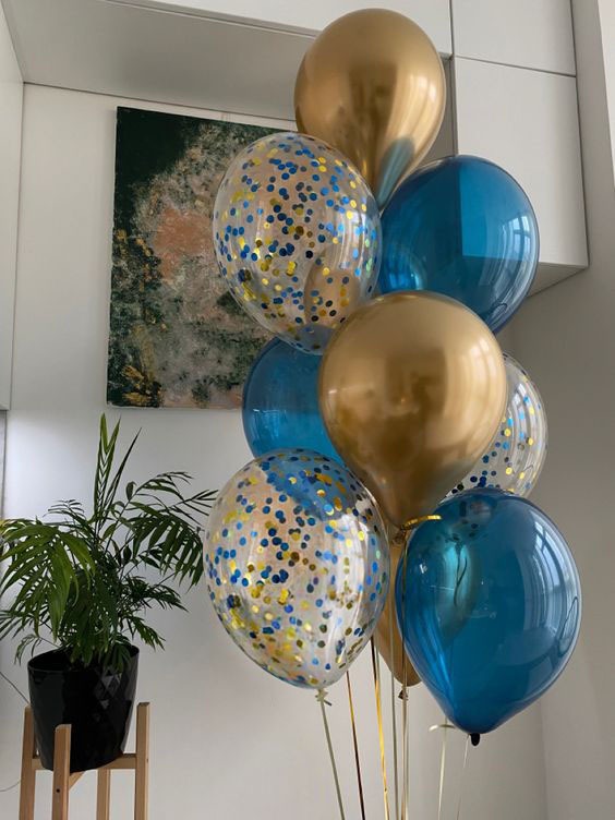 Фонтан на грузе с золотыми и синими гелиевыми шарами