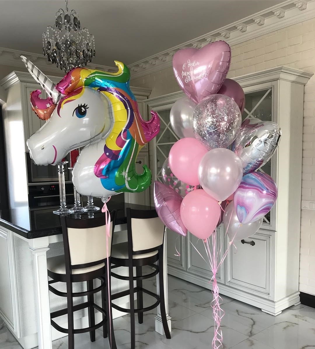 Фонтан на грузике с розовыми шарами и головой единорога