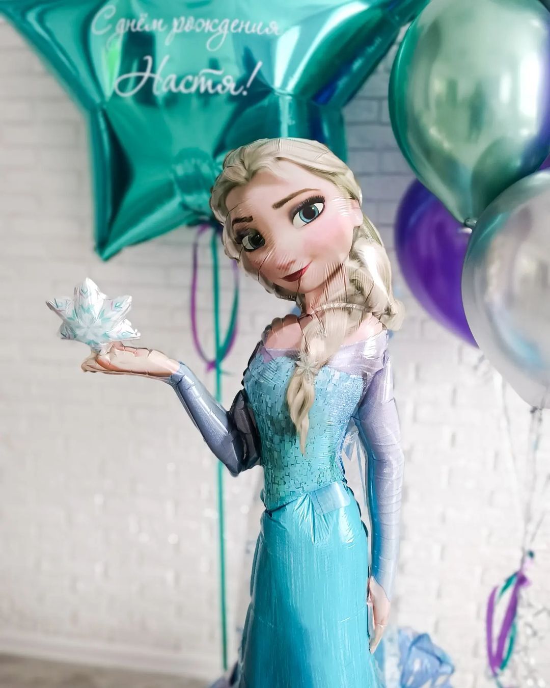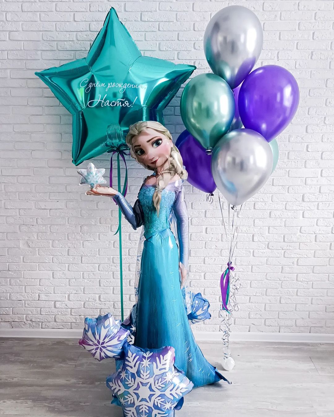 Фонтан шаров с большой именной звездой и ростовым шаром “Эльза”