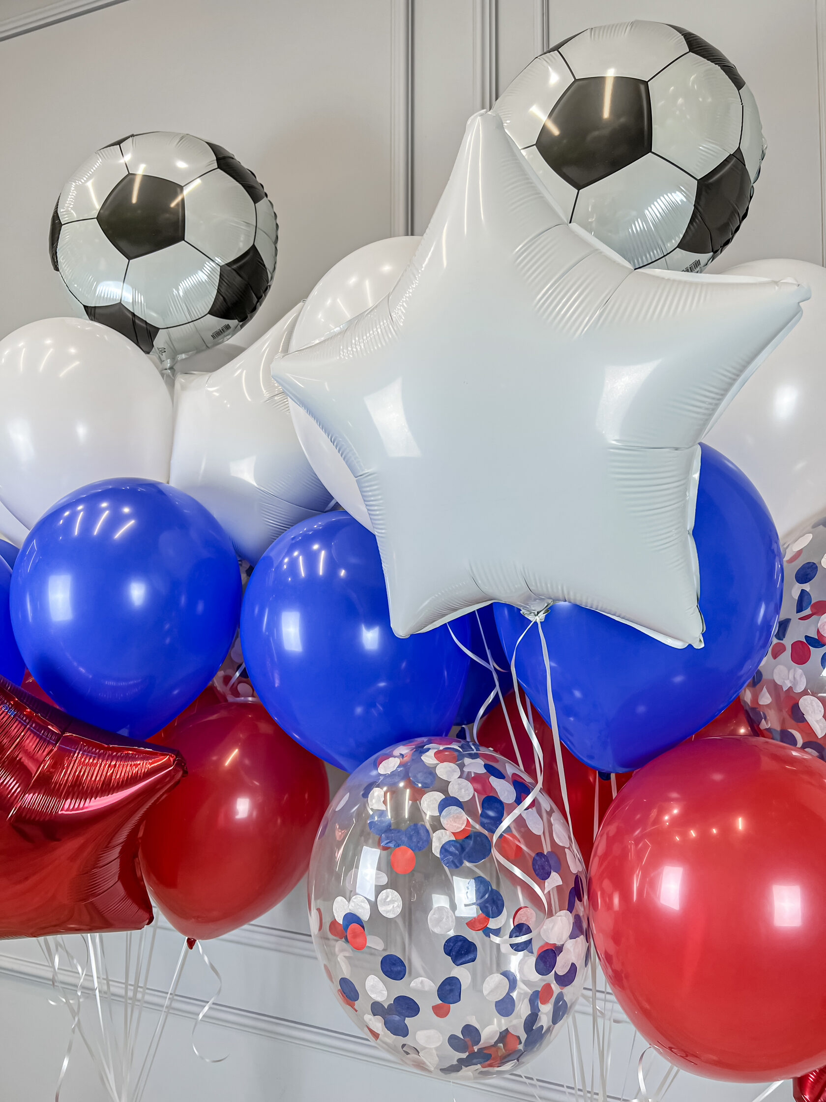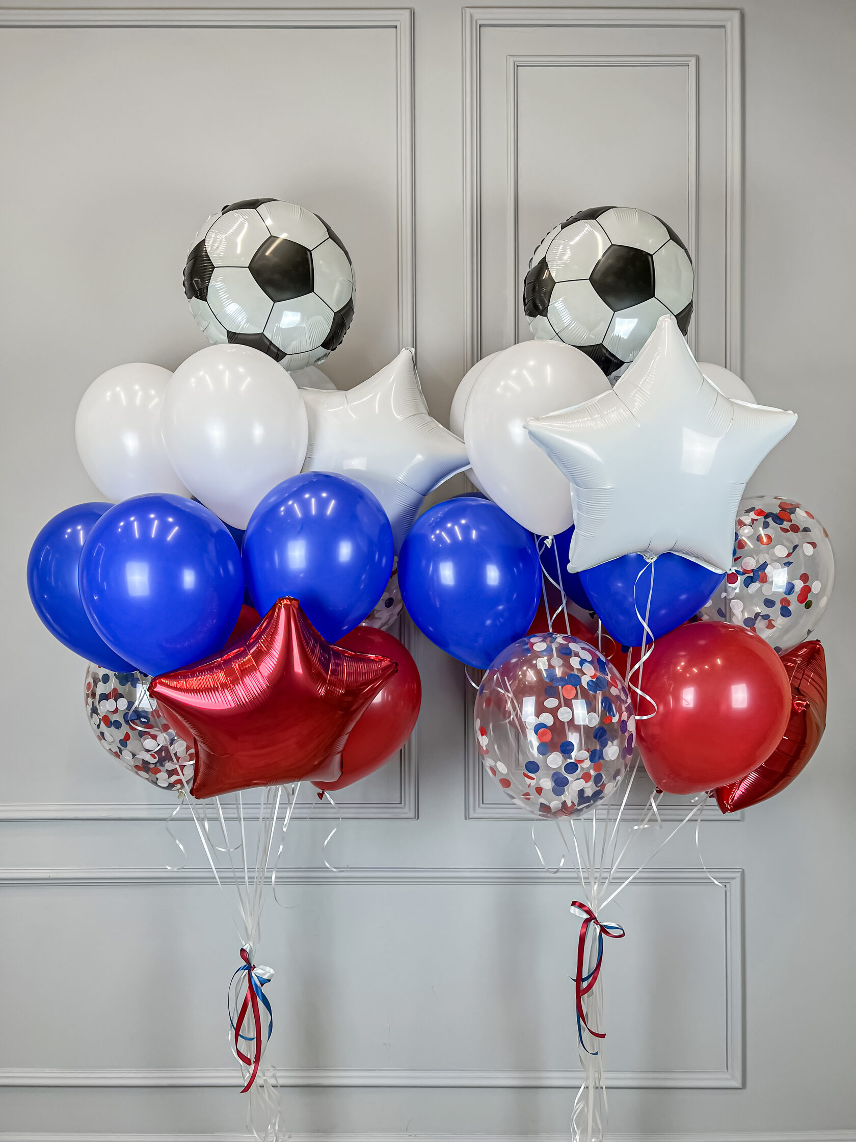 Фонтаны из гелиевых шаров триколор и футбольными мячами