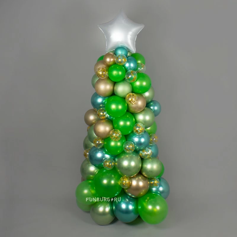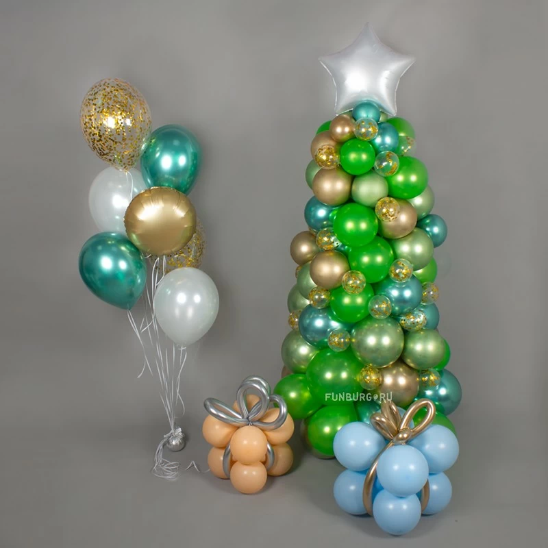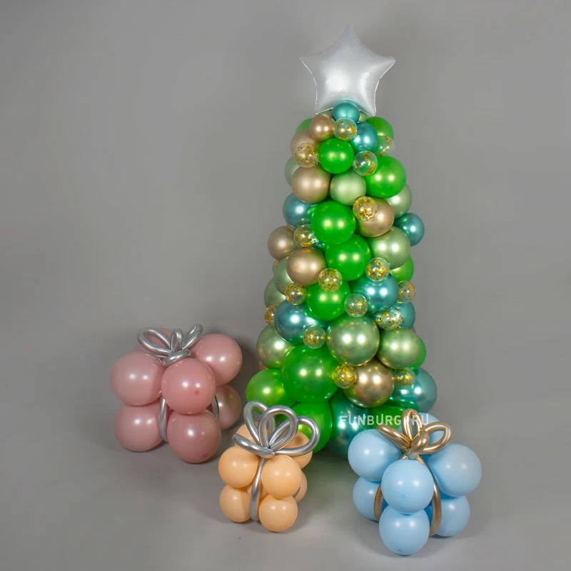 Эффектная и простая фотозона из почти двухметровой сияющей елочки из разнокалиберных шариков, фонтанов из шаров и фигурок в форме подарков. С ней новогодние праздники точно запомнятся! А кроме ярких воспоминаний останется еще много-много красивых праздничных фотографий!