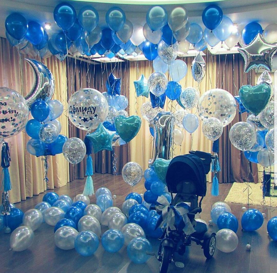 Гелиевые шары под потолок, на пол и в букетах на один год мальчику