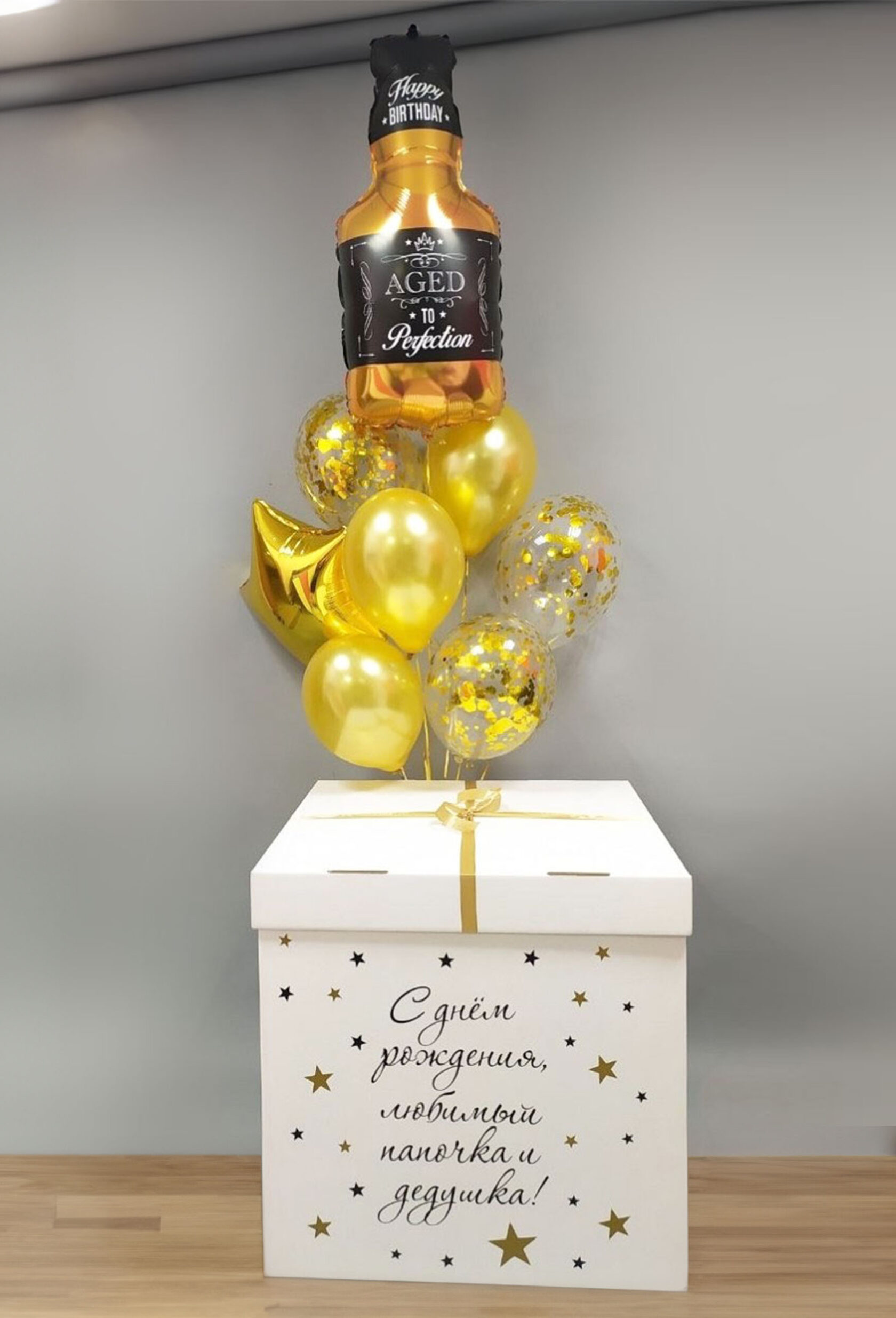 Гелиевые шары в коробке-сюрприз с бутылкой виски