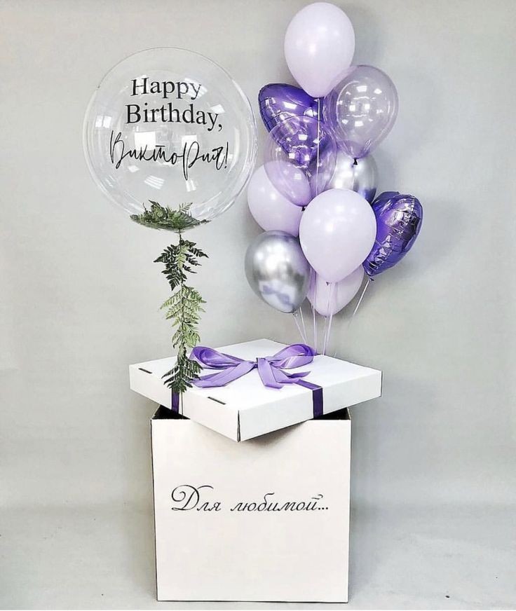 Гелиевые шары в сиреневых оттенках в белой коробке
