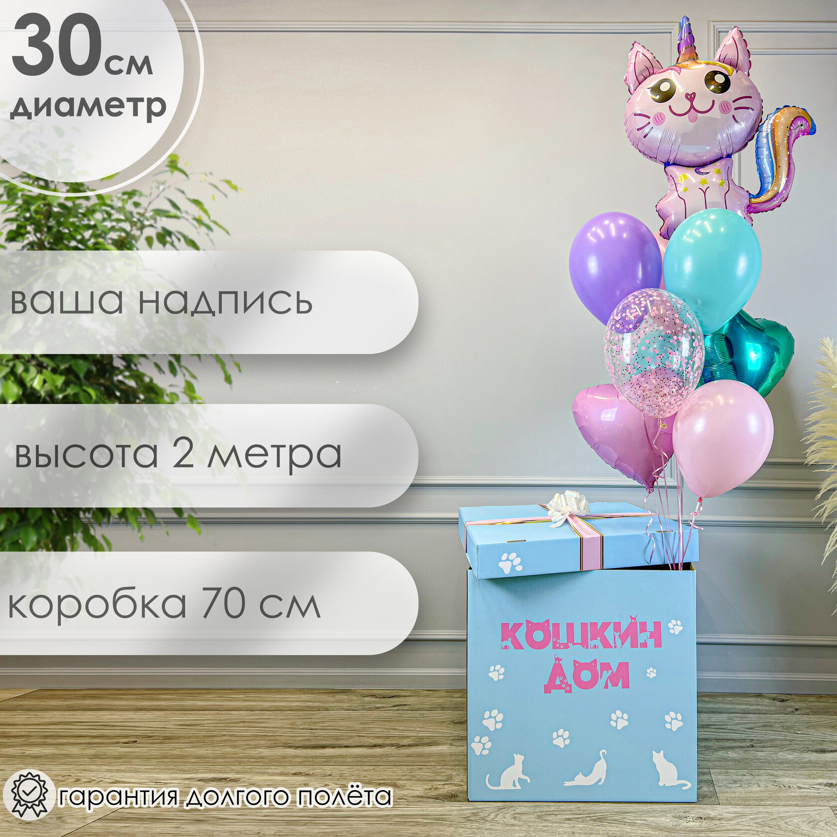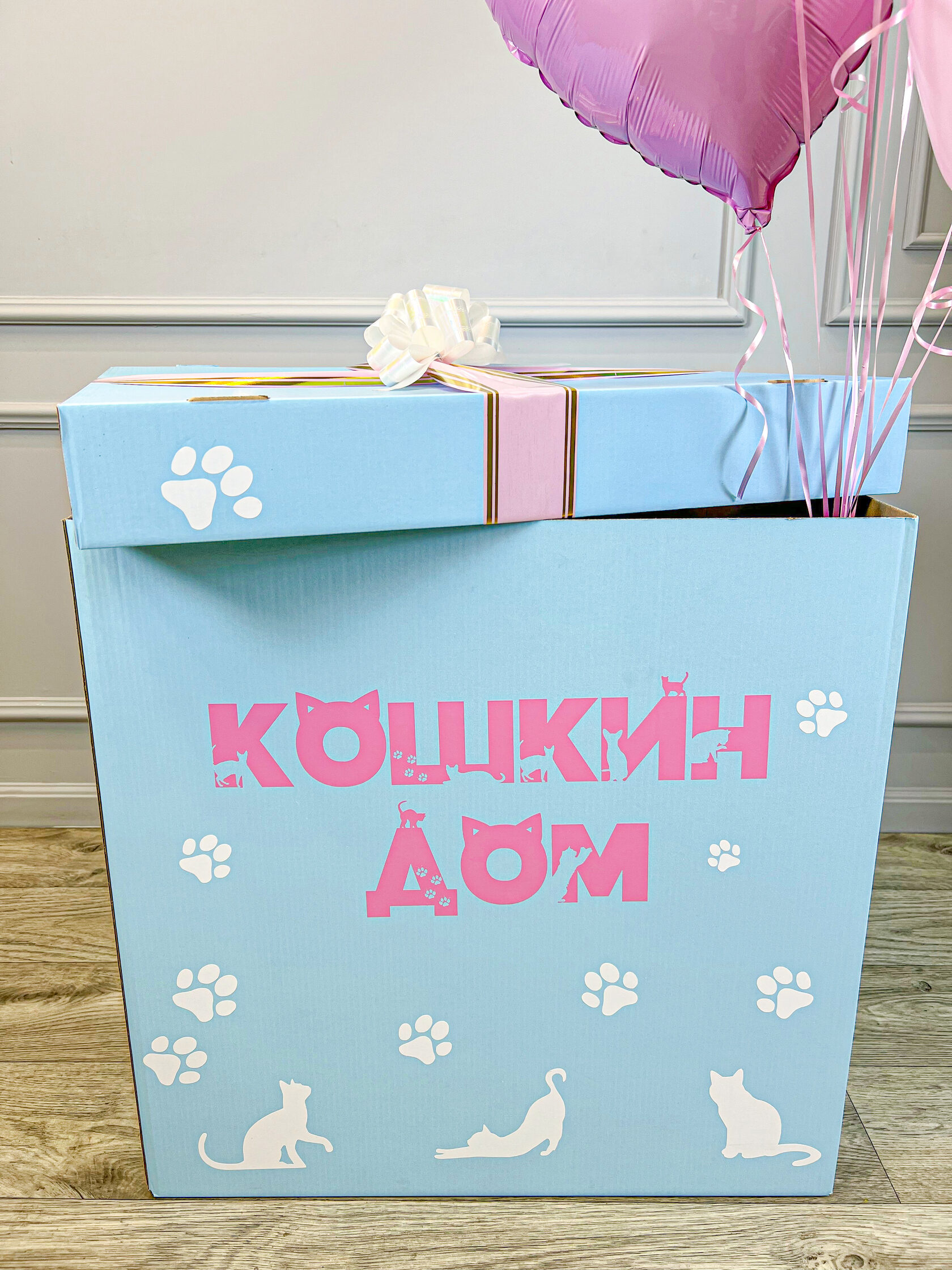 Голубая коробка с шарами для девочки “Кошкин дом”